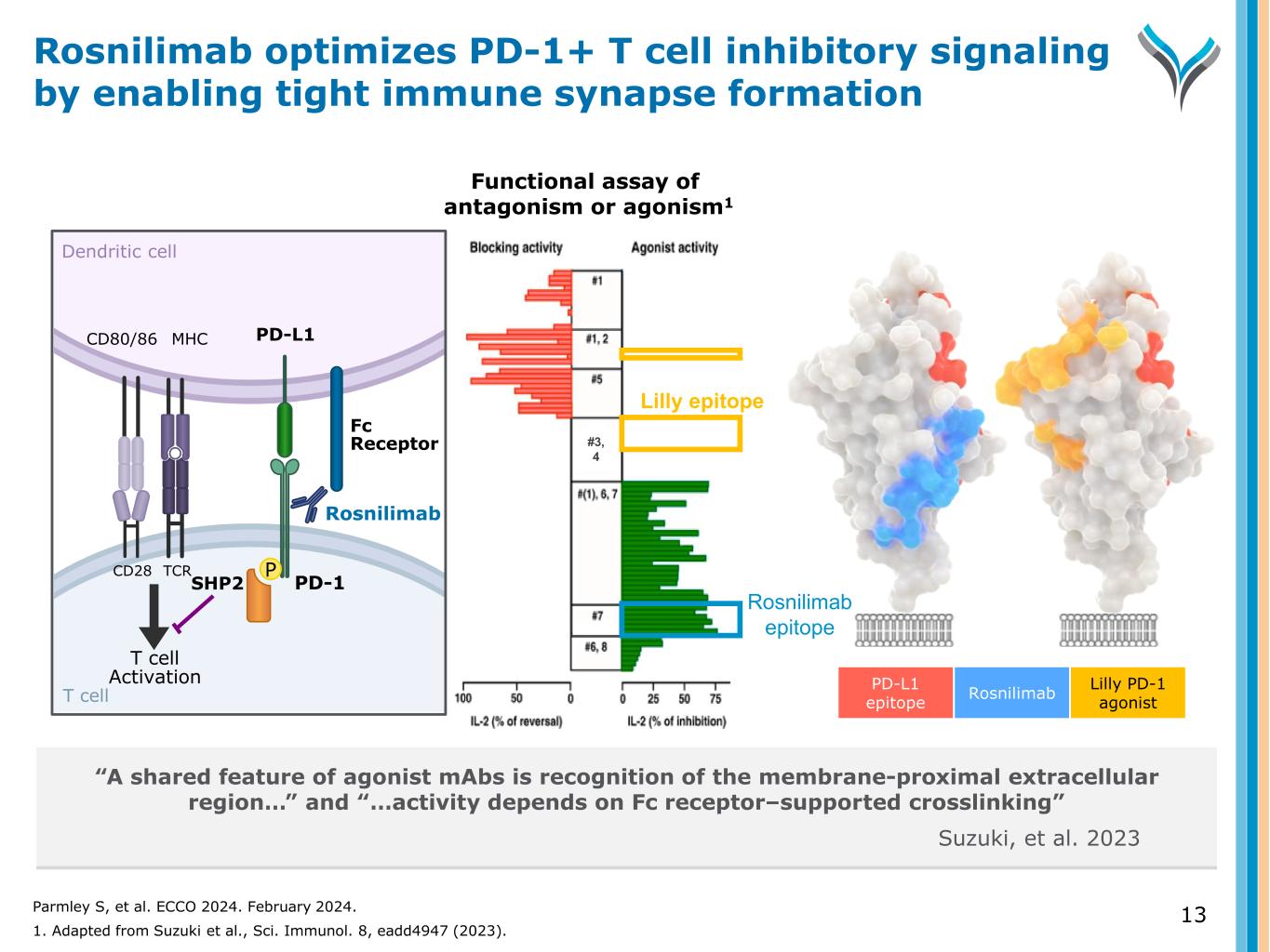 Parmley S, et al. ECCO 2024. February 2024. 1. Adapted from Suzuki et al., Sci. Immunol. 8, eadd4947 (2023). 13 Dendritic cell T cell T cell Activation MHCCD80/86 SHP2 TCRCD28 P PD-1 PD-L1 Rosnilimab Fc Receptor #3, 4 Functional assay of antagonism or agonism1 Lilly epitope PD-L1 epitope Lilly PD-1 agonistRosnilimab Rosnilimab epitope Rosnilimab optimizes PD-1+ T cell inhibitory signaling by enabling tight immune synapse formation “A shared feature of agonist mAbs is recognition of the membrane-proximal extracellular region…” and “…activity depends on Fc receptor–supported crosslinking” Suzuki, et al. 2023