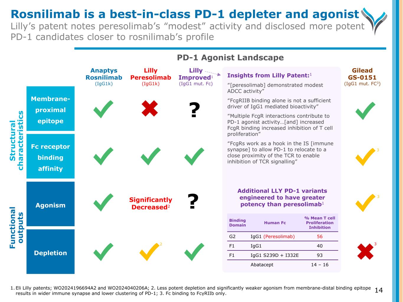 14 PD-1 Agonist Landscape Fc receptor binding affinity Depletion Agonism Membrane- proximal epitope S tr u ct u ra l ch a ra ct e ri st ic s Fu n ct io n a l o u tp u ts Rosnilimab is a best-in-class PD-1 depleter and agonist Lilly’s patent notes peresolimab’s “modest” activity and disclosed more potent PD-1 candidates closer to rosnilimab’s profile Lilly Peresolimab (IgG1k) Anaptys Rosnilimab (IgG1k) Significantly Decreased2 Lilly Improved1 (IgG1 mut. Fc) ? 2 ? Insights from Lilly Patent:1 “[peresolimab] demonstrated modest ADCC activity” “FcgRIIB binding alone is not a sufficient driver of IgG1 mediated bioactivity” “Multiple FcgR interactions contribute to PD-1 agonist activity…[and] increased FcgR binding increased inhibition of T cell proliferation” “FcgRs work as a hook in the IS [immune synapse] to allow PD-1 to relocate to a close proximity of the TCR to enable inhibition of TCR signalling” Gilead GS-0151 (IgG1 mut. FC3) 3 3 3 Additional LLY PD-1 variants engineered to have greater potency than peresolimab1 Binding Domain Human Fc % Mean T cell Proliferation Inhibition G2 IgG1 (Peresolimab) 56 F1 IgG1 40 F1 IgG1 S239D + I332E 93 Abatacept 14 – 16 1. Eli Lilly patents; WO2024196694A2 and WO2024040206A; 2. Less potent depletion and significantly weaker agonism from membrane-distal binding epitope results in wider immune synapse and lower clustering of PD-1; 3. Fc binding to FcγRIIb only.