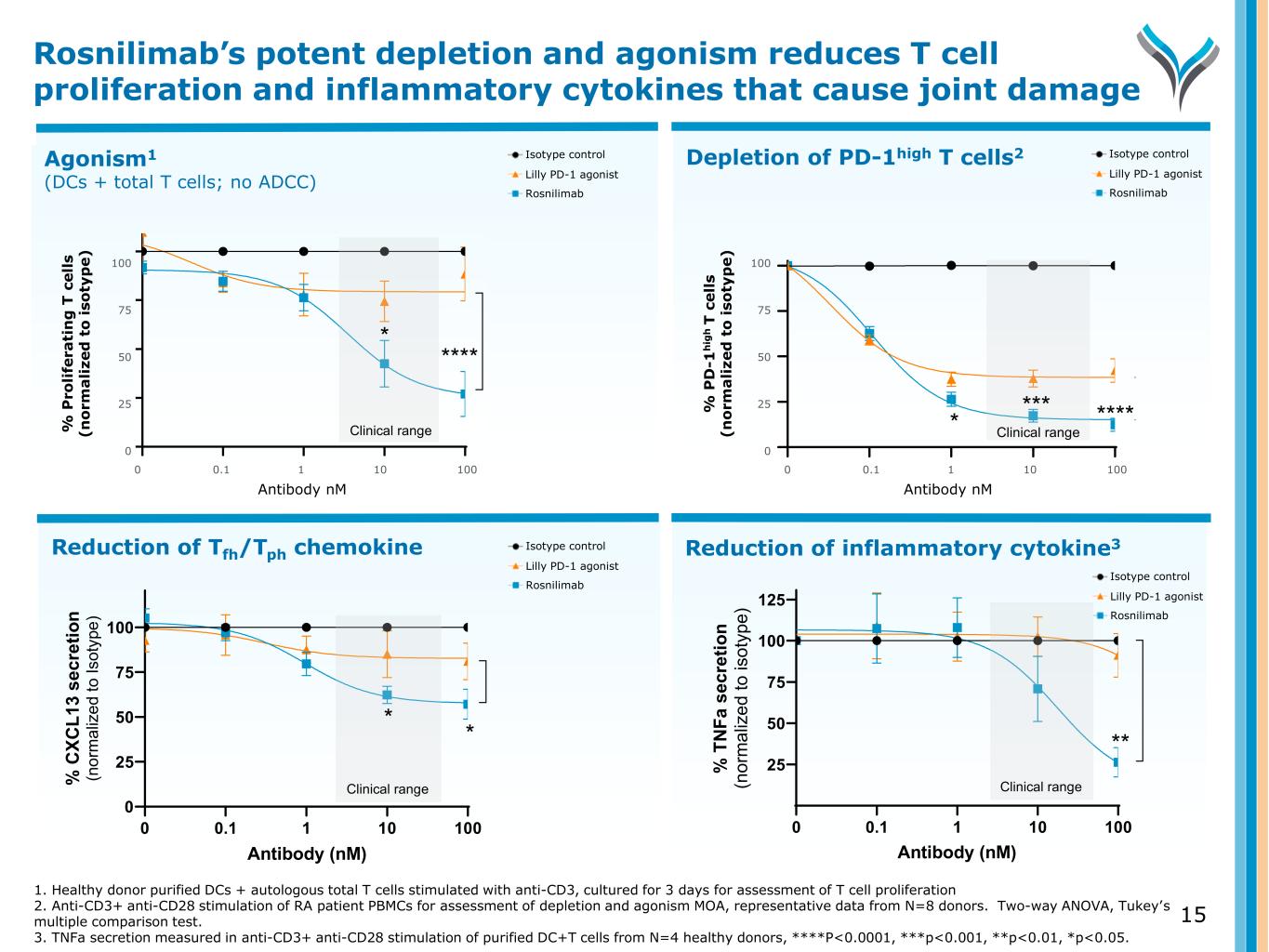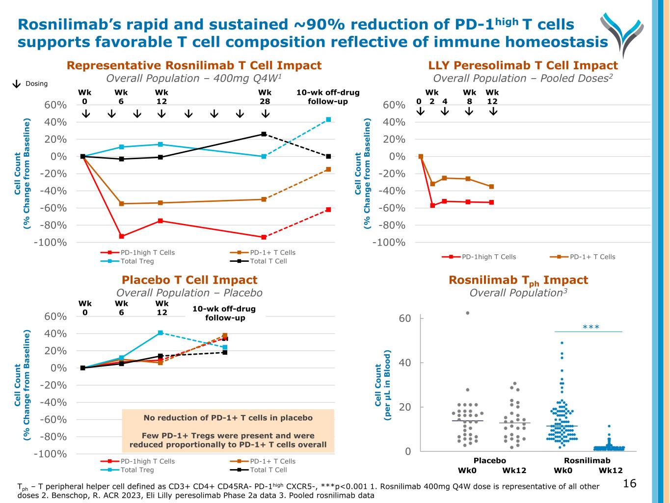 15 1. Healthy donor purified DCs + autologous total T cells stimulated with anti-CD3, cultured for 3 days for assessment of T cell proliferation 2. Anti-CD3+ anti-CD28 stimulation of RA patient PBMCs for assessment of depletion and agonism MOA, representative data from N=8 donors. Two-way ANOVA, Tukey’s multiple comparison test. 3. TNFa secretion measured in anti-CD3+ anti-CD28 stimulation of purified DC+T cells from N=4 healthy donors, ****P<0.0001, ***p<0.001, **p<0.01, *p<0.05. Rosnilimab’s potent depletion and agonism reduces T cell proliferation and inflammatory cytokines that cause joint damage Depletion of PD-1high T cells2 % P D -1 h ig h T c el ls (n o rm a li ze d t o i so ty p e) Clinical range *** ***** 100 75 50 25 0 0 0.1 1 10 1000.1 1 10 100 0 25 50 75 100 Antibody (nM) % P ro lif er at in g T ce lls (n or m al iz ed to is ot yp e) 0 Clinical range Isotype control Rosnilimab Lilly PD-1 agonist **** * Agonism1 (DCs + total T cells; no ADCC) Rosnilimab Isotype control Lilly PD-1 agonist % P ro li fe ra ti n g T c el ls (n o rm a li ze d t o i so ty p e) 100 75 50 25 0 0 . 0 10 Antibody nM Antibody nM Reduction of Tfh/Tph chemokine Reduction of inflammatory cytokine3 0 25 50 75 100 0 0.1 1 10 100 Antibody (nM) % C XC L1 3 se cr et io n (n or m al iz ed to Is ot yp e) Clinical range * * 25 50 75 100 125 Antibody (nM) % T NF a se cr et io n (n or m al iz ed to is ot yp e) 1001010.10 Clinical range ** Rosnilimab Isotype control Lilly PD-1 agonist Rosnilimab Isotype control Lilly PD-1 agonist Rosnilimab Isotype control Lilly PD-1 agonist