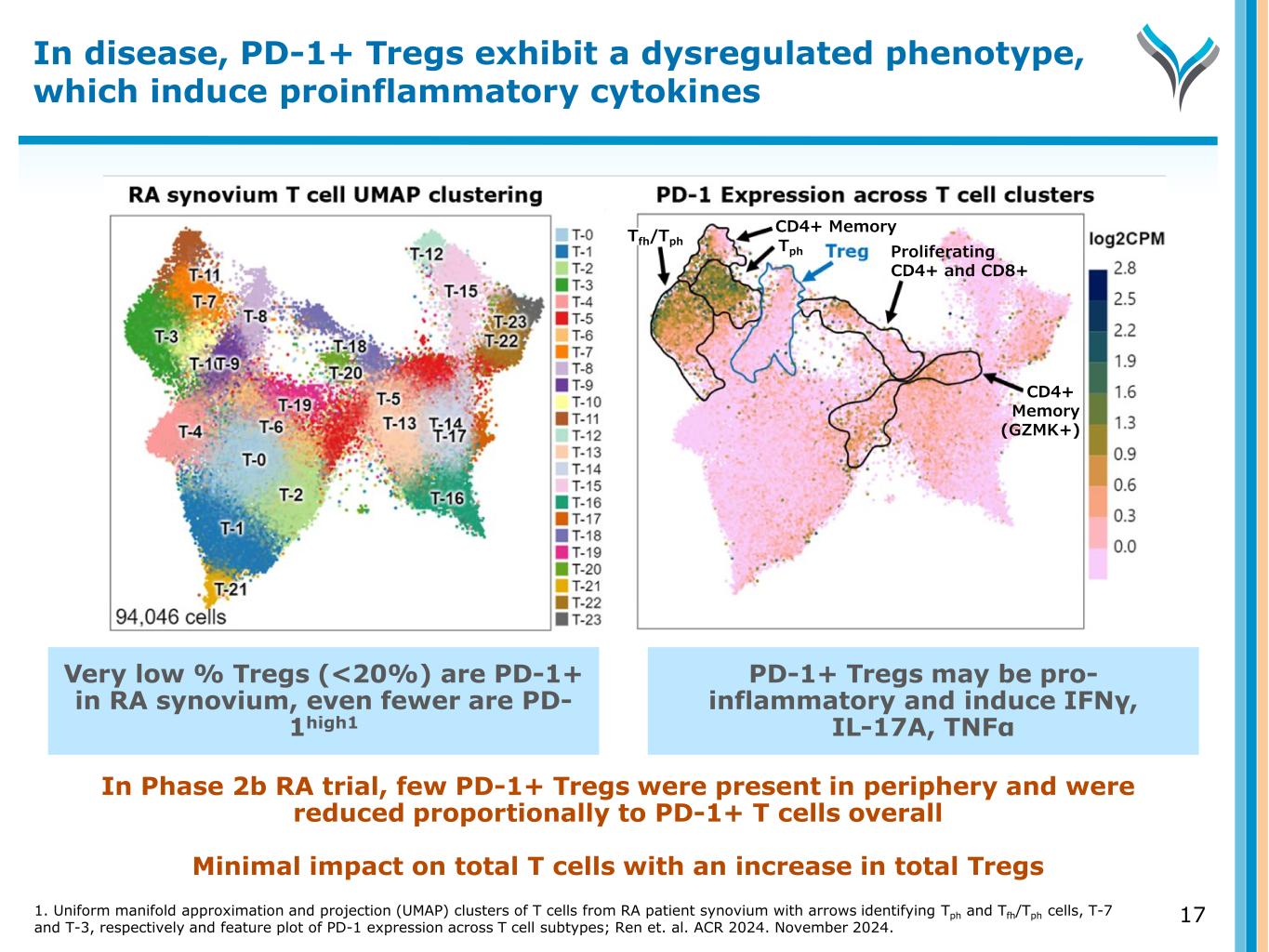 17 In disease, PD-1+ Tregs exhibit a dysregulated phenotype, which induce proinflammatory cytokines Very low % Tregs (<20%) are PD-1+ in RA synovium, even fewer are PD- 1high1 In Phase 2b RA trial, few PD-1+ Tregs were present in periphery and were reduced proportionally to PD-1+ T cells overall Minimal impact on total T cells with an increase in total Tregs PD-1+ Tregs may be pro- inflammatory and induce IFNγ, IL-17A, TNFα Tfh/Tph Tph CD4+ Memory Proliferating CD4+ and CD8+ CD4+ Memory (GZMK+) 1. Uniform manifold approximation and projection (UMAP) clusters of T cells from RA patient synovium with arrows identifying Tph and Tfh/Tph cells, T-7 and T-3, respectively and feature plot of PD-1 expression across T cell subtypes; Ren et. al. ACR 2024. November 2024.