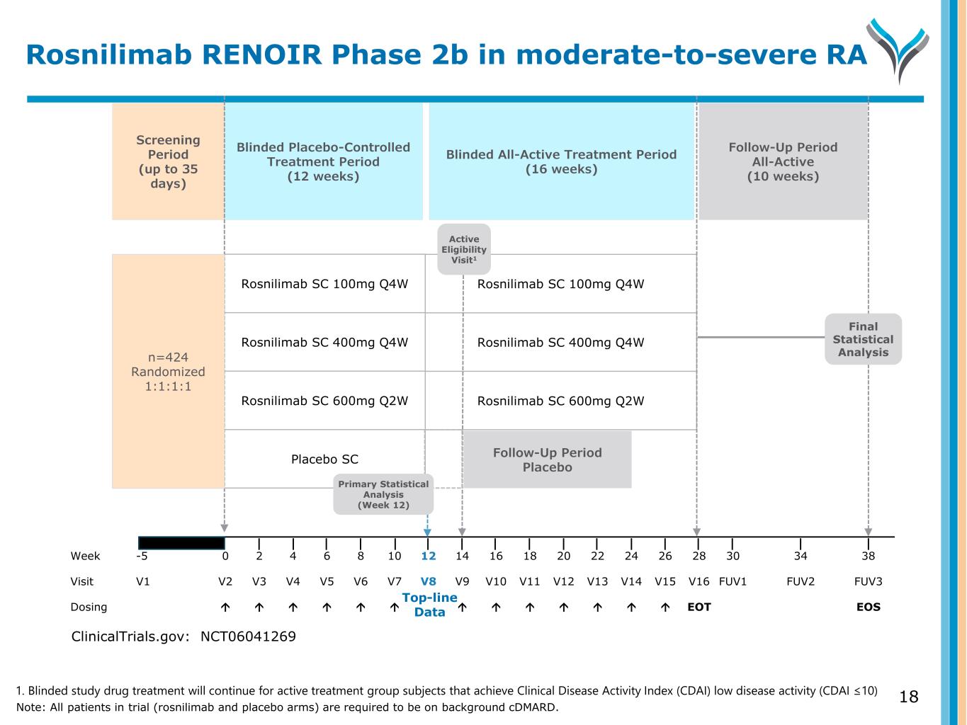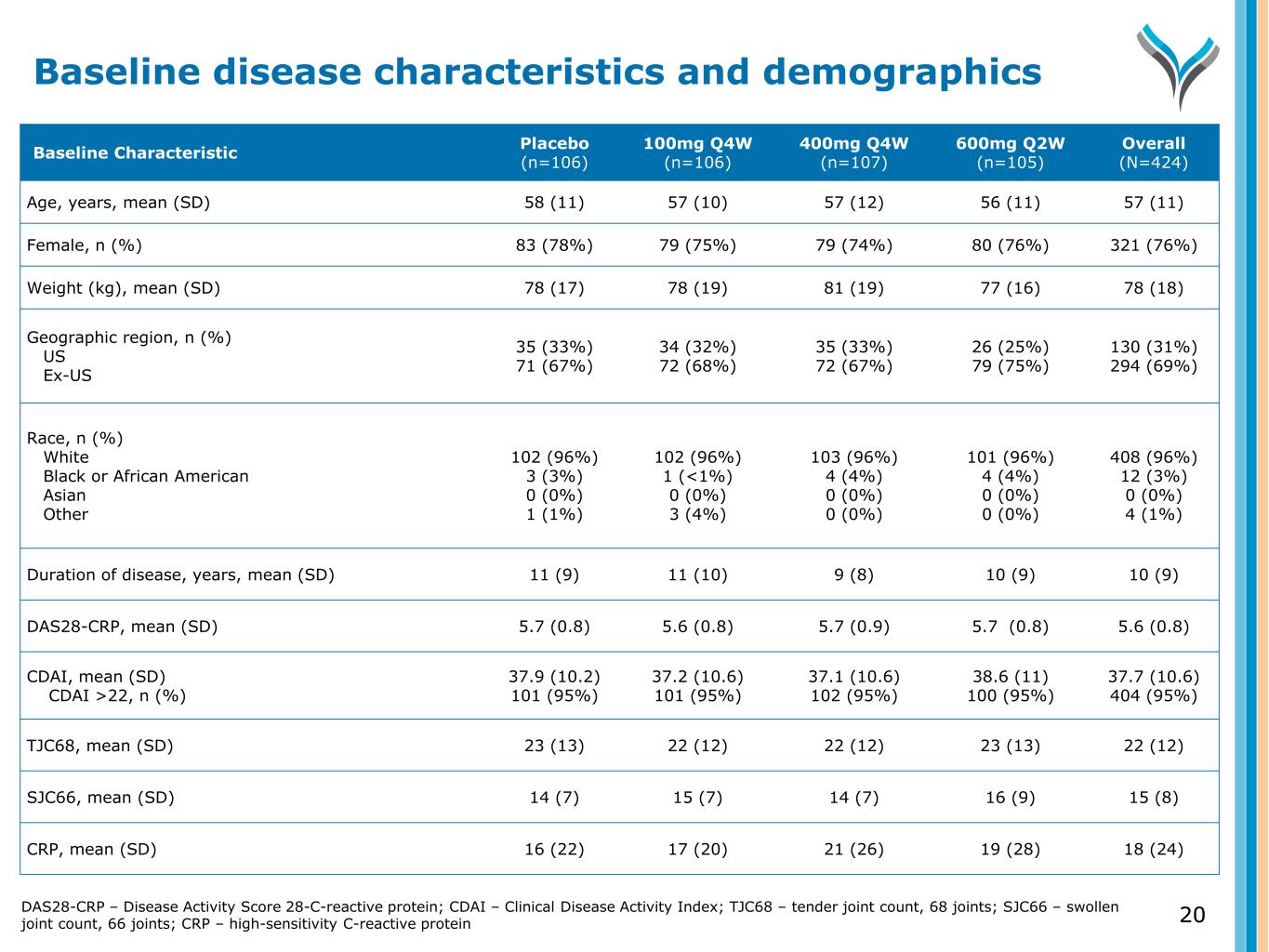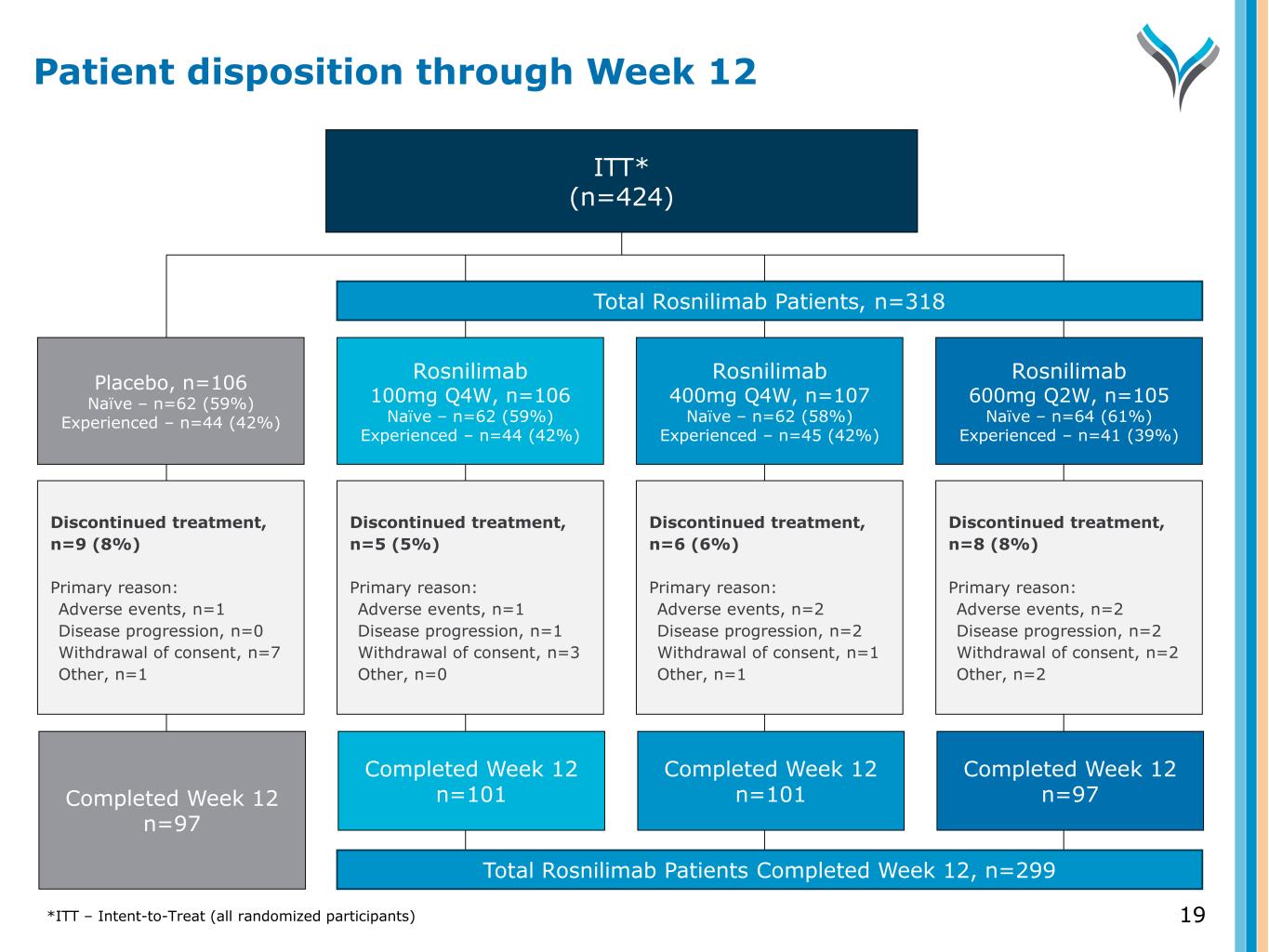 18 Screening Period (up to 35 days) Blinded Placebo-Controlled Treatment Period (12 weeks) Follow-Up Period All-Active (10 weeks) Blinded All-Active Treatment Period (16 weeks) Week -5 0 2 4 6 8 10 12 14 16 18 20 22 24 26 28 30 34 38 Visit V1 V2 V3 V4 V5 V6 V7 V8 V9 V10 V11 V12 V13 V14 V15 V16 FUV1 FUV2 FUV3 Dosing              EOT EOS Rosnilimab SC 100mg Q4W Rosnilimab SC 400mg Q4W Rosnilimab SC 600mg Q2W Placebo SC Rosnilimab SC 100mg Q4W Rosnilimab SC 400mg Q4W Rosnilimab SC 600mg Q2W n=424 Randomized 1:1:1:1 Final Statistical Analysis Top-line Data 1. Blinded study drug treatment will continue for active treatment group subjects that achieve Clinical Disease Activity Index (CDAI) low disease activity (CDAI ≤10) Active Eligibility Visit1 Note: All patients in trial (rosnilimab and placebo arms) are required to be on background cDMARD. ClinicalTrials.gov: NCT06041269 Rosnilimab RENOIR Phase 2b in moderate-to-severe RA Follow-Up Period Placebo Primary Statistical Analysis (Week 12)