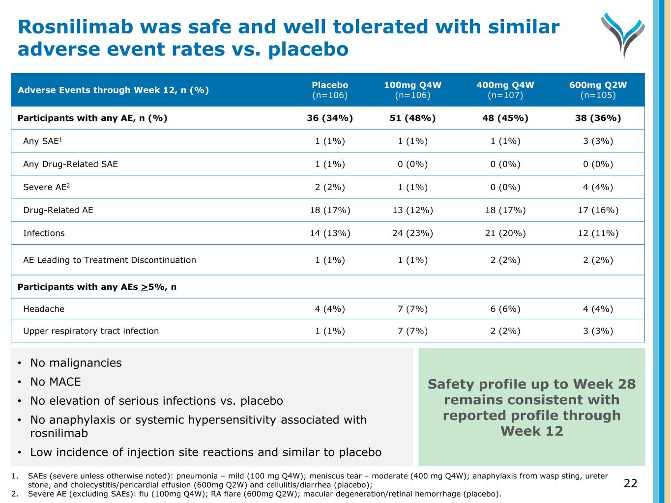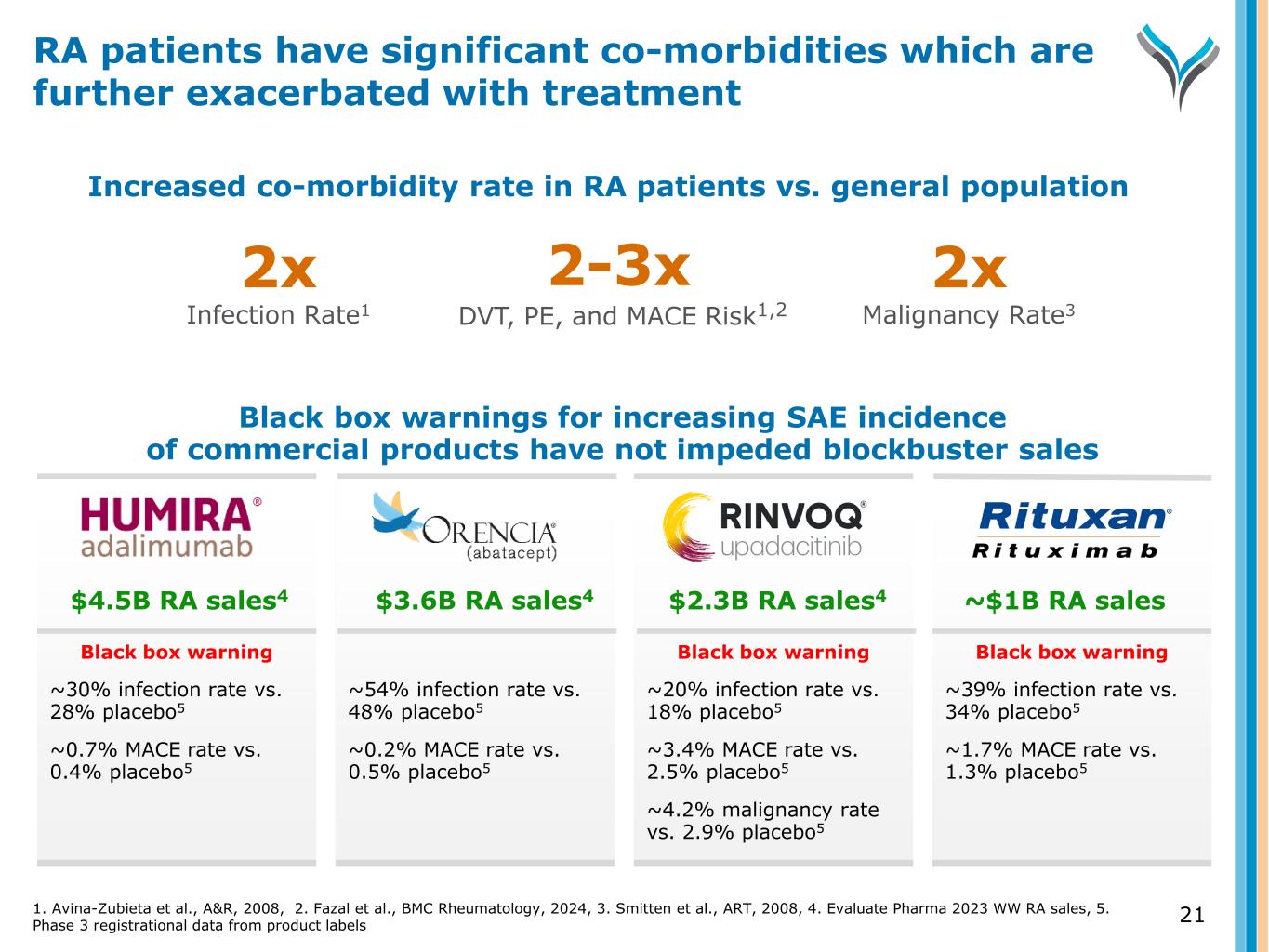 Black box warnings for increasing SAE incidence of commercial products have not impeded blockbuster sales Black box warning ~30% infection rate vs. 28% placebo5 ~0.7% MACE rate vs. 0.4% placebo5 ~54% infection rate vs. 48% placebo5 ~0.2% MACE rate vs. 0.5% placebo5 Black box warning ~20% infection rate vs. 18% placebo5 ~3.4% MACE rate vs. 2.5% placebo5 ~4.2% malignancy rate vs. 2.9% placebo5 Black box warning ~39% infection rate vs. 34% placebo5 ~1.7% MACE rate vs. 1.3% placebo5 21 Increased co-morbidity rate in RA patients vs. general population 2-3x DVT, PE, and MACE Risk1,2 2x Infection Rate1 2x Malignancy Rate3 $4.5B RA sales4 $3.6B RA sales4 $2.3B RA sales4 ~$1B RA sales 1. Avina-Zubieta et al., A&R, 2008, 2. Fazal et al., BMC Rheumatology, 2024, 3. Smitten et al., ART, 2008, 4. Evaluate Pharma 2023 WW RA sales, 5. Phase 3 registrational data from product labels RA patients have significant co-morbidities which are further exacerbated with treatment