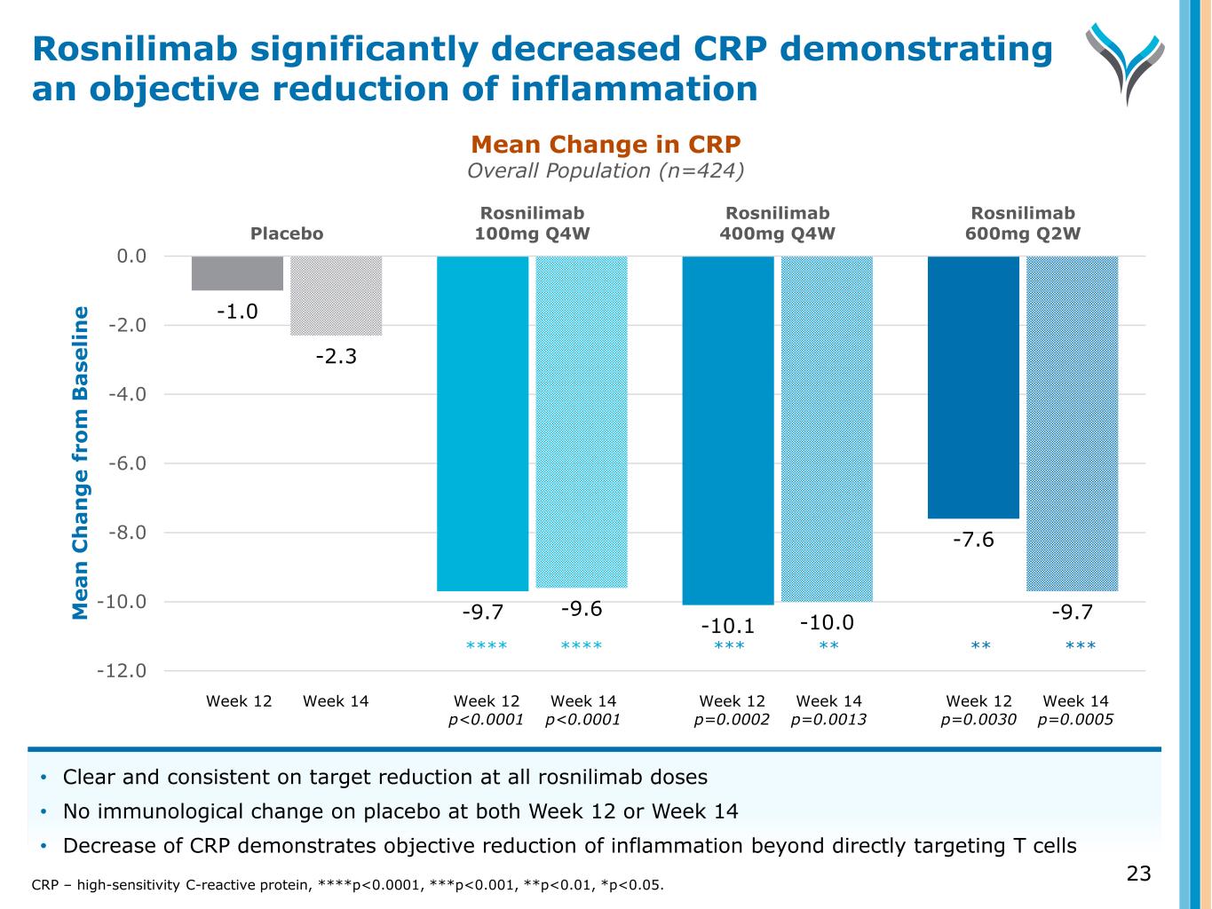 23 -1.0 -9.7 -10.1 -7.6 -2.3 -9.6 -10.0 -9.7 -12.0 -10.0 -8.0 -6.0 -4.0 -2.0 0.0 Placebo Rosnilimab 100mg Q4W Rosnilimab 400mg Q4W Rosnilimab 600mg Q2W M e a n C h a n g e f ro m B a se li n e • Clear and consistent on target reduction at all rosnilimab doses • No immunological change on placebo at both Week 12 or Week 14 • Decrease of CRP demonstrates objective reduction of inflammation beyond directly targeting T cells CRP – high-sensitivity C-reactive protein, ****p<0.0001, ***p<0.001, **p<0.01, *p<0.05. Week 12 Week 14 Week 12 p<0.0001 Week 14 p<0.0001 Week 12 p=0.0002 Week 14 p=0.0013 Week 12 p=0.0030 Week 14 p=0.0005 **** **** *** ** ** *** Rosnilimab significantly decreased CRP demonstrating an objective reduction of inflammation Mean Change in CRP Overall Population (n=424)
