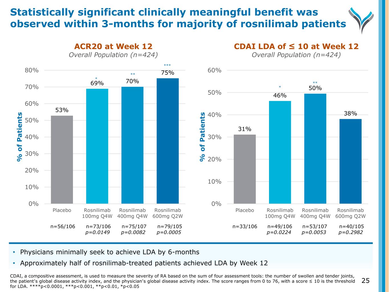 24 -3.0 -2.5 -2.0 -1.5 -1.0 -0.5 0.0 Week 0 Week 2 Week 4 Week 6 Week 8 Week 10 Week 12 Week 14 M e a n C h a n g e f ro m B a se li n e • All rosnilimab doses statistically significant at Week 12 • All rosnilimab doses continue to improve into Week 14 with no evidence of flattening • Following Week 14 visit, placebo patients proceeded to post treatment follow-up Placebo Rosnilimab - 100mg Q4W Rosnilimab - 400mg Q4W Rosnilimab - 600mg Q2W Data table includes n values for patients that completed visit; DAS28-CRP based on differential weighting of individual measures, including patient’s general health, CRP and a count of 28 swollen and tender joints, with a score ranging from 0 to 9.4. ****p<0.0001, ***p<0.001, **p<0.01, *p<0.05, Standard error (SE) used to present figures of least squares mean changes from baseline. ** Week 12 statistical significance • 600mg Q2W: p=0.0062 • 400mg Q4W: p=0.0016 • 100mg Q4W: p=0.0092 ** ** * * **** **** **** Mean Change in DAS28-CRP Over Time Overall Population (n=424) Rosnilimab met primary endpoint of mean change from baseline in DAS28-CRP at Week 12 for all active doses Placebo n=106 n=105 n=103 n=100 n=100 n=99 n=97 n=90 100mg Q4W n=106 n=106 n=106 n=105 n=104 n=102 n=101 n=101 400mg Q4W n=107 n=107 n=107 n=105 n=104 n=102 n=101 n=99 600mg Q2W n=105 n=104 n=104 n=103 n=99 n=97 n=97 n=97 Rosnilimab Total n=318 n=317 n=317 n=313 n=307 n=301 n=299 n=297