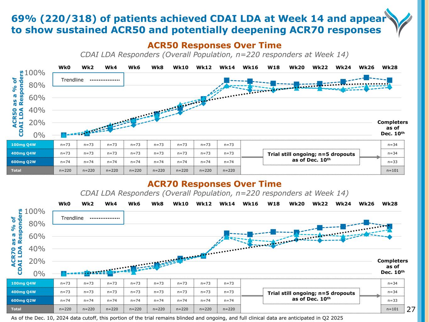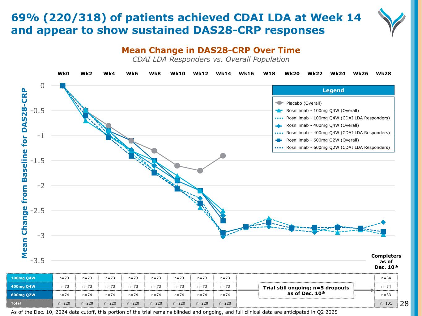 0% 20% 40% 60% 80% 100% A C R 5 0 a s a % o f C D A I LD A R e sp o n d e rs Wk0 Wk2 Wk4 Wk6 Wk8 Wk10 Wk12 Wk14 Wk16 W18 Wk20 Wk22 Wk24 Wk26 Wk28 0% 20% 40% 60% 80% 100% A C R 7 0 a s a % o f C D A I LD A R e sp o n d e rs Wk0 Wk2 Wk4 Wk6 Wk8 Wk10 Wk12 Wk14 Wk16 W18 Wk20 Wk22 Wk24 Wk26 Wk28 Completers as of Dec. 10th ACR50 Responses Over Time CDAI LDA Responders (Overall Population, n=220 responders at Week 14) ACR70 Responses Over Time CDAI LDA Responders (Overall Population, n=220 responders at Week 14) Trendline Trendline 69% (220/318) of patients achieved CDAI LDA at Week 14 and appear to show sustained ACR50 and potentially deepening ACR70 responses 27 100mg Q4W n=73 n=73 n=73 n=73 n=73 n=73 n=73 n=73 n=34 400mg Q4W n=73 n=73 n=73 n=73 n=73 n=73 n=73 n=73 n=34 600mg Q2W n=74 n=74 n=74 n=74 n=74 n=74 n=74 n=74 n=33 Total n=220 n=220 n=220 n=220 n=220 n=220 n=220 n=220 n=101 Trial still ongoing; n=5 dropouts as of Dec. 10th Completers as of Dec. 10th 100mg Q4W n=73 n=73 n=73 n=73 n=73 n=73 n=73 n=73 n=34 400mg Q4W n=73 n=73 n=73 n=73 n=73 n=73 n=73 n=73 n=34 600mg Q2W n=74 n=74 n=74 n=74 n=74 n=74 n=74 n=74 n=33 Total n=220 n=220 n=220 n=220 n=220 n=220 n=220 n=220 n=101 As of the Dec. 10, 2024 data cutoff, this portion of the trial remains blinded and ongoing, and full clinical data are anticipated in Q2 2025 Trial still ongoing; n=5 dropouts as of Dec. 10th