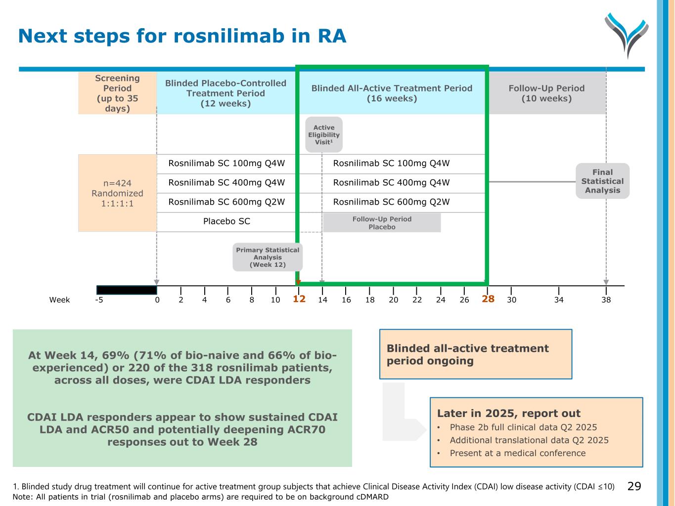 -3.5 -3 -2.5 -2 -1.5 -1 -0.5 0 M e a n C h a n g e f ro m B a se li n e f o r D A S 2 8 -C R P Wk0 Wk2 Wk4 Wk6 Wk8 Wk10 Wk12 Wk14 Wk16 W18 Wk20 Wk22 Wk24 Wk26 Wk28 Mean Change in DAS28-CRP Over Time CDAI LDA Responders vs. Overall Population 69% (220/318) of patients achieved CDAI LDA at Week 14 and appear to show sustained DAS28-CRP responses 28 Completers as of Dec. 10th 100mg Q4W n=73 n=73 n=73 n=73 n=73 n=73 n=73 n=73 n=34 400mg Q4W n=73 n=73 n=73 n=73 n=73 n=73 n=73 n=73 n=34 600mg Q2W n=74 n=74 n=74 n=74 n=74 n=74 n=74 n=74 n=33 Total n=220 n=220 n=220 n=220 n=220 n=220 n=220 n=220 n=101 As of the Dec. 10, 2024 data cutoff, this portion of the trial remains blinded and ongoing, and full clinical data are anticipated in Q2 2025 Legend Placebo (Overall) Rosnilimab - 100mg Q4W (Overall) Rosnilimab - 100mg Q4W (CDAI LDA Responders) Rosnilimab - 400mg Q4W (Overall) Rosnilimab - 400mg Q4W (CDAI LDA Responders) Rosnilimab - 600mg Q2W (Overall) Rosnilimab - 600mg Q2W (CDAI LDA Responders) Trial still ongoing; n=5 dropouts as of Dec. 10th