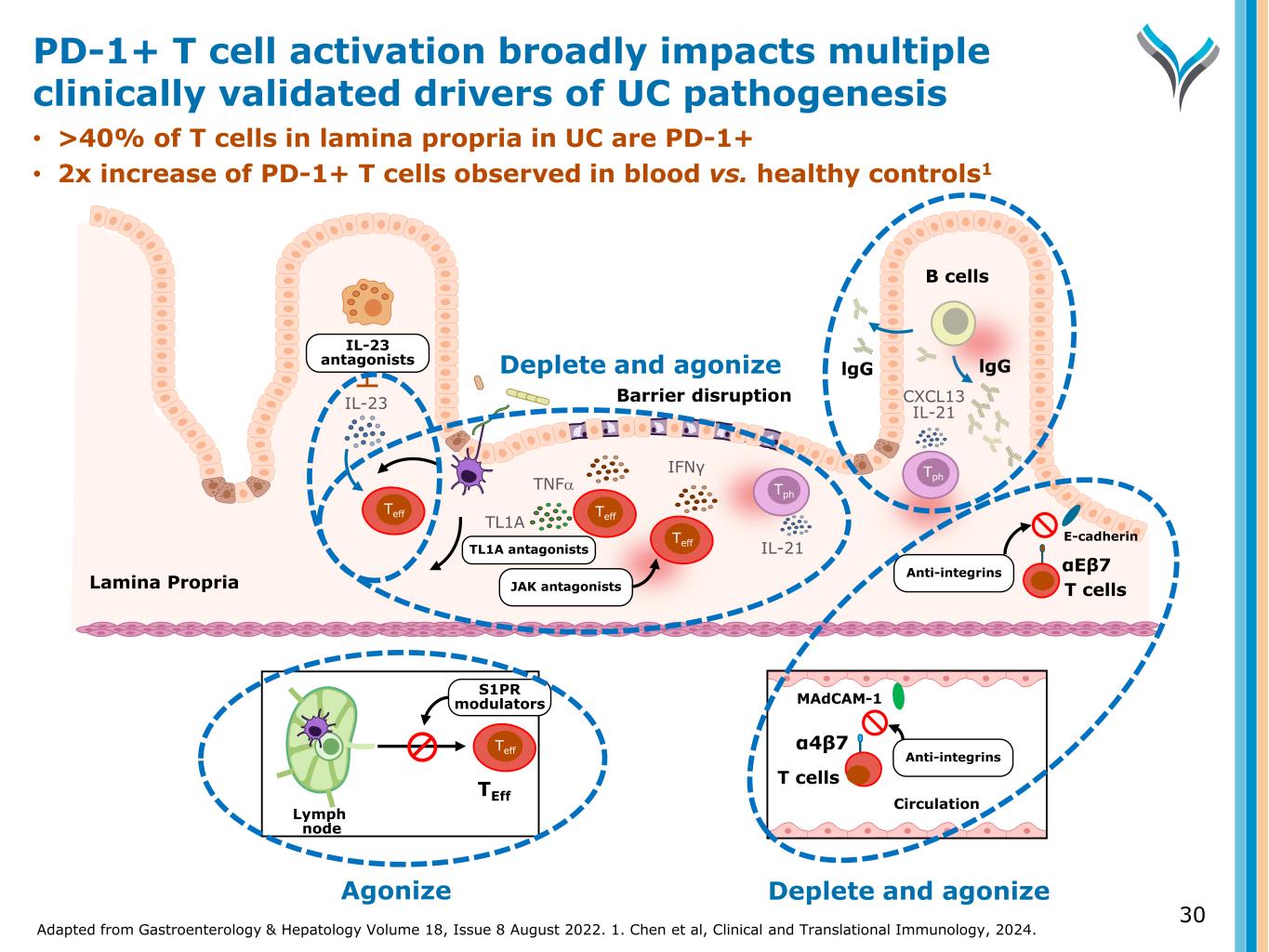 Adapted from Gastroenterology & Hepatology Volume 18, Issue 8 August 2022. 1. Chen et al, Clinical and Translational Immunology, 2024. 30 PD-1+ T cell activation broadly impacts multiple clinically validated drivers of UC pathogenesis • >40% of T cells in lamina propria in UC are PD-1+ • 2x increase of PD-1+ T cells observed in blood vs. healthy controls1 B cells IL-23 antagonists αEβ7 Lymph node S1PR modulators TEff MAdCAM-1 Anti-integrins α4β7 Circulation Anti-integrins E-cadherin IFNγ IL-21 T cells T cells CXCL13 IL-21 JAK antagonists lgGlgG Barrier disruption TNFα IL-23 TL1A TL1A antagonists Teff Teff Teff Teff Agonize Deplete and agonize Deplete and agonize Tph Tph Lamina Propria