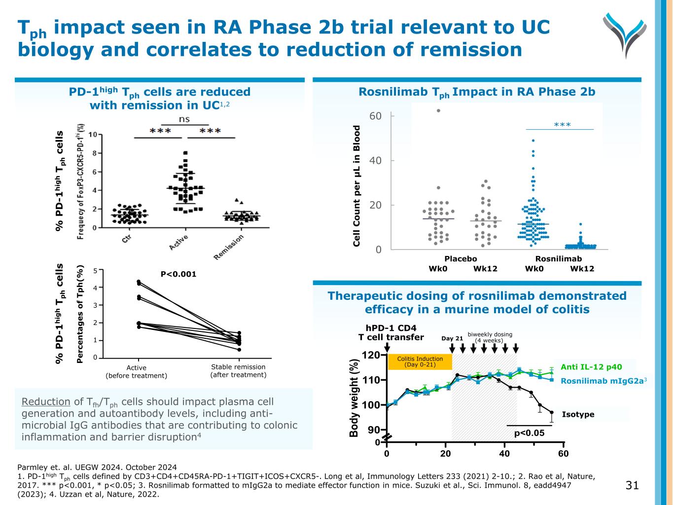 Therapeutic dosing of rosnilimab demonstrated efficacy in a murine model of colitis PD-1high Tph cells are reduced with remission in UC1,2 31 Tph impact seen in RA Phase 2b trial relevant to UC biology and correlates to reduction of remission % P D -1 h ig h T p h c e ll s % P D -1 h ig h T p h c e ll s Active (before treatment) Stable remission (after treatment) 5 4 3 2 1 0P er ce n ta g es o f T p h (% ) P<0.001 Reduction of Tfh/Tph cells should impact plasma cell generation and autoantibody levels, including anti- microbial IgG antibodies that are contributing to colonic inflammation and barrier disruption4 Parmley et. al. UEGW 2024. October 2024 1. PD-1high Tph cells defined by CD3+CD4+CD45RA-PD-1+TIGIT+ICOS+CXCR5-. Long et al, Immunology Letters 233 (2021) 2-10.; 2. Rao et al, Nature, 2017. *** p<0.001, * p<0.05; 3. Rosnilimab formatted to mIgG2a to mediate effector function in mice. Suzuki et al., Sci. Immunol. 8, eadd4947 (2023); 4. Uzzan et al, Nature, 2022. 0 20 40 60 Bo dy w ei gh t ( % ) 100 110 120 90 Rosnilimab Isotype 0 p<0.05 Anti IL-12 p40 Colitis Induction (Day 0-21) hPD-1 CD4 T cell transfer biweekly dosing (4 weeks)Day 21 nilimab mIgG2a3 Anti IL-12 p40 Isotyp Rosnilimab Tph Impact in RA Phase 2b 0 20 40 60 C e ll C o u n t p e r μ L in B lo o d Wk0 Wk12 Wk0 Wk12 Placebo Rosnilimab ***
