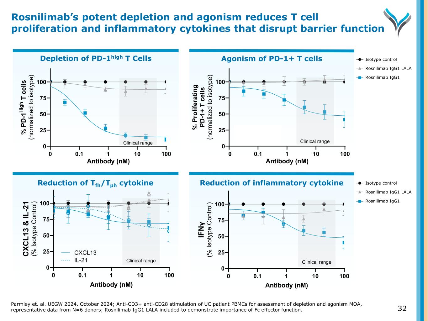 Reduction of Tfh/Tph cytokine 0 25 50 75 100 0 0.1 1 10 100 Antibody (nM) C XC L1 3 & IL -2 1 (% Is ot yp e C on tro l) IL-21 CXCL13 Clinical range Reduction of inflammatory cytokine Agonism of PD-1+ T cellsDepletion of PD-1high T Cells Parmley et. al. UEGW 2024. October 2024; Anti-CD3+ anti-CD28 stimulation of UC patient PBMCs for assessment of depletion and agonism MOA, representative data from N=6 donors; Rosnilimab IgG1 LALA included to demonstrate importance of Fc effector function. 32 Rosnilimab’s potent depletion and agonism reduces T cell proliferation and inflammatory cytokines that disrupt barrier function 0.1 1 10 100 0 25 50 75 100 Antibody (nM) % P D -1 H ig h T c el ls (n or m al iz ed to is ot yp e) 0 Clinical range 0.1 1 10 100 0 25 50 75 100 Antibody (nM) % P ro lif er at in g PD -1 + T ce lls (n or m al iz ed to is ot yp e) 0 Clinical range 0 25 50 75 100 0 0.1 1 10 100 Antibody (nM) IF N γ (% Is ot yp e C on tro l) Clinical range Isotype control Rosnilimab IgG1 LALA Rosnilimab IgG1 Isotype control Rosnilimab IgG1 LALA Rosnilimab IgG1