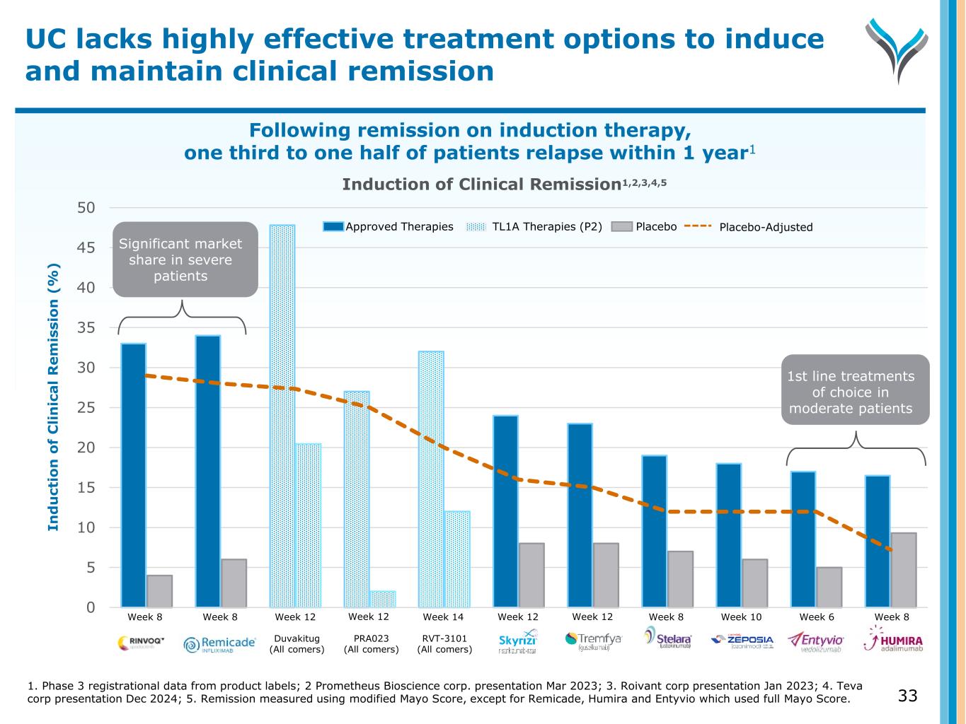Following remission on induction therapy, one third to one half of patients relapse within 1 year1 1. Phase 3 registrational data from product labels; 2 Prometheus Bioscience corp. presentation Mar 2023; 3. Roivant corp presentation Jan 2023; 4. Teva corp presentation Dec 2024; 5. Remission measured using modified Mayo Score, except for Remicade, Humira and Entyvio which used full Mayo Score. 33 UC lacks highly effective treatment options to induce and maintain clinical remission 0 5 10 15 20 25 30 35 40 45 50 In d u ct io n o f C li n ic a l R e m is si o n ( % ) Week 8 Week 8 Week 6Week 8 Week 10 Week 8Week 14Week 12 PRA023 (All comers) RVT-3101 (All comers) Significant market share in severe patients 1st line treatments of choice in moderate patients Induction of Clinical Remission1,2,3,4,5 Approved Therapies Placebo Duvakitug (All comers) Week 12 Week 12 Week 12 Placebo-AdjustedTL1A Therapies (P2)