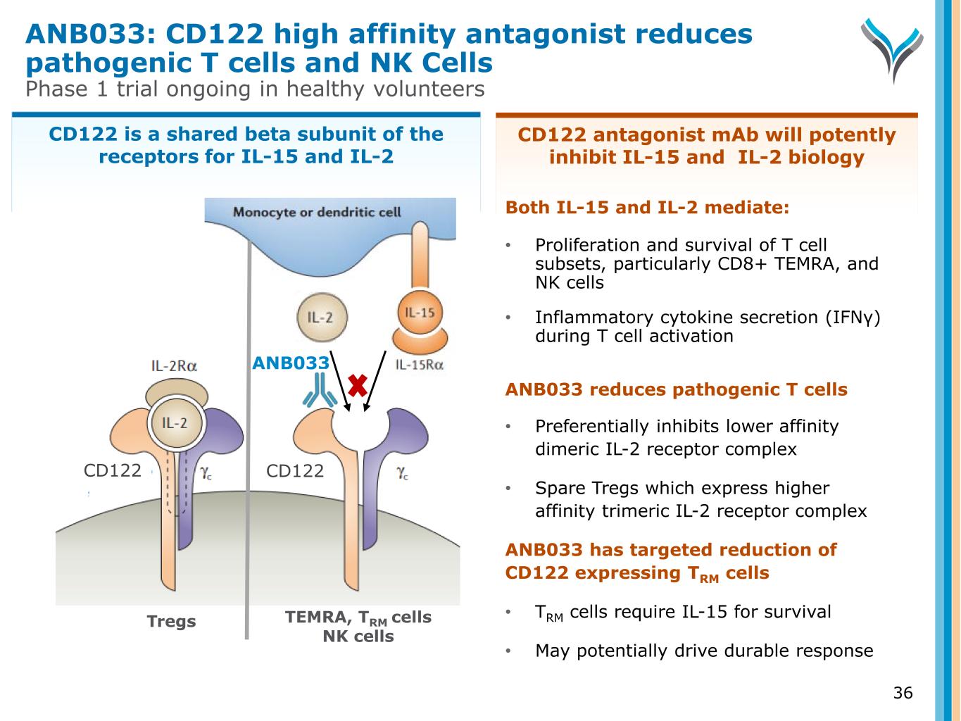 36 CD122 is a shared beta subunit of the receptors for IL-15 and IL-2 CD122 antagonist mAb will potently inhibit IL-15 and IL-2 biology Both IL-15 and IL-2 mediate: • Proliferation and survival of T cell subsets, particularly CD8+ TEMRA, and NK cells • Inflammatory cytokine secretion (IFNγ) during T cell activation ANB033 reduces pathogenic T cells • Preferentially inhibits lower affinity dimeric IL-2 receptor complex • Spare Tregs which express higher affinity trimeric IL-2 receptor complex ANB033 has targeted reduction of CD122 expressing TRM cells • TRM cells require IL-15 for survival • May potentially drive durable response Tregs TEMRA, TRM cells NK cells CD122 CD122 ANB033 ANB033: CD122 high affinity antagonist reduces pathogenic T cells and NK Cells Phase 1 trial ongoing in healthy volunteers