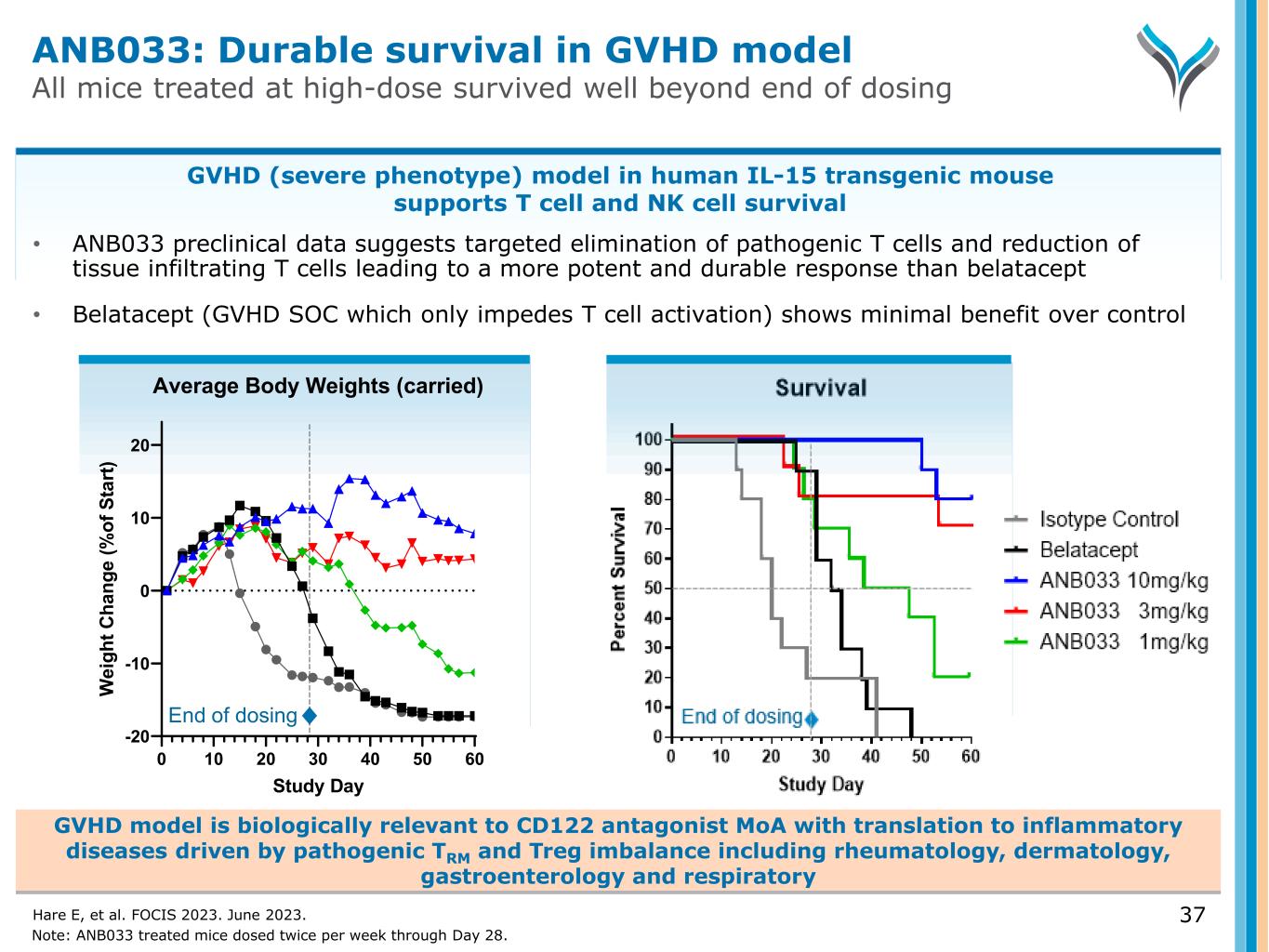 GVHD (severe phenotype) model in human IL-15 transgenic mouse supports T cell and NK cell survival • ANB033 preclinical data suggests targeted elimination of pathogenic T cells and reduction of tissue infiltrating T cells leading to a more potent and durable response than belatacept • Belatacept (GVHD SOC which only impedes T cell activation) shows minimal benefit over control End of dosing Note: ANB033 treated mice dosed twice per week through Day 28. 37 0 10 20 30 40 50 60 -20 -10 0 10 20 Average Body Weights (carried) Study Day W ei gh t C ha ng e (% of S ta rt) Hare E, et al. FOCIS 2023. June 2023. GVHD model is biologically relevant to CD122 antagonist MoA with translation to inflammatory diseases driven by pathogenic TRM and Treg imbalance including rheumatology, dermatology, gastroenterology and respiratory ANB033: Durable survival in GVHD model All mice treated at high-dose survived well beyond end of dosing