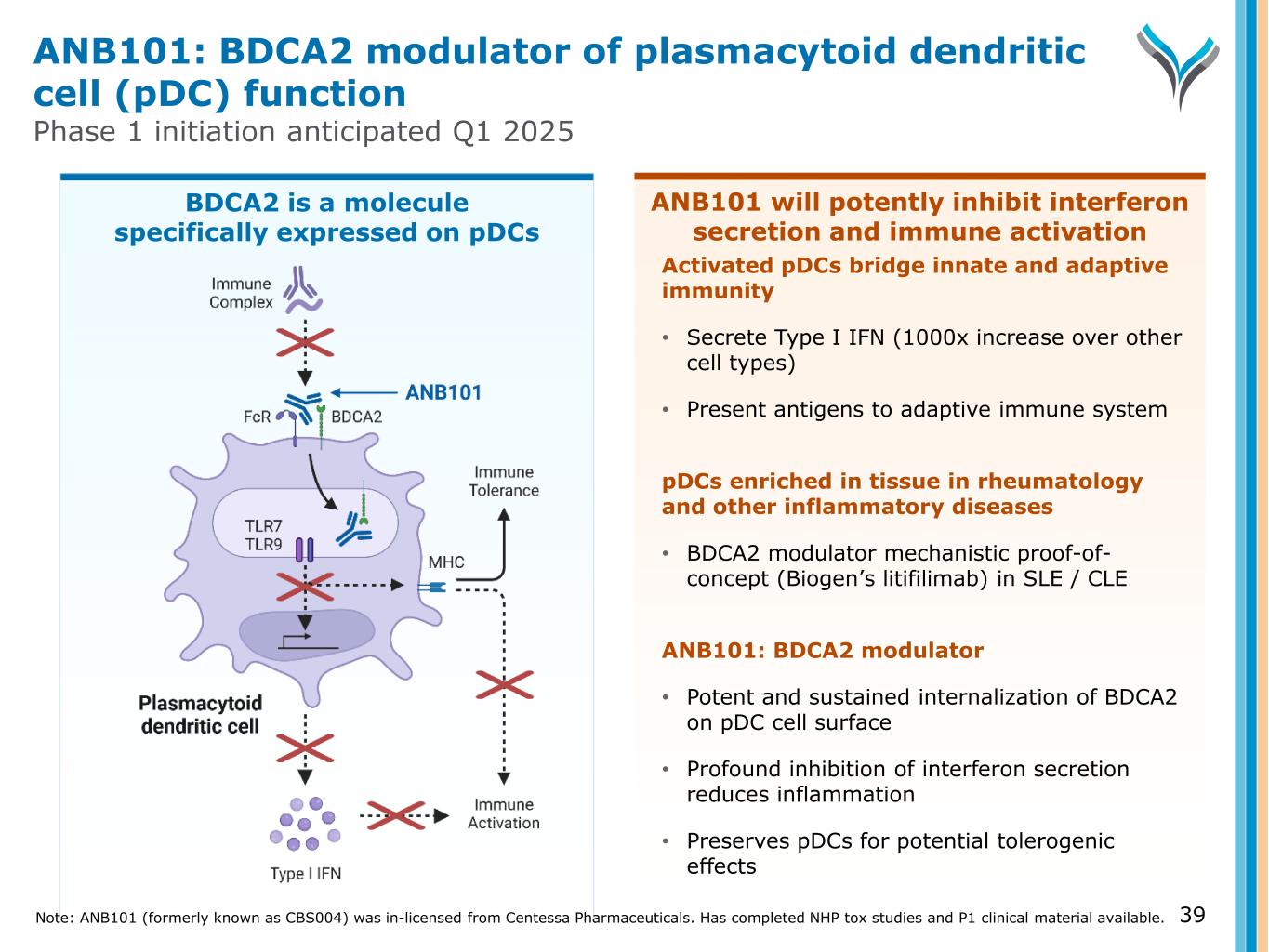 ANB101 will potently inhibit interferon secretion and immune activation 39 Activated pDCs bridge innate and adaptive immunity • Secrete Type I IFN (1000x increase over other cell types) • Present antigens to adaptive immune system pDCs enriched in tissue in rheumatology and other inflammatory diseases • BDCA2 modulator mechanistic proof-of- concept (Biogen’s litifilimab) in SLE / CLE ANB101: BDCA2 modulator • Potent and sustained internalization of BDCA2 on pDC cell surface • Profound inhibition of interferon secretion reduces inflammation • Preserves pDCs for potential tolerogenic effects ANB101: BDCA2 modulator of plasmacytoid dendritic cell (pDC) function Phase 1 initiation anticipated Q1 2025 BDCA2 is a molecule specifically expressed on pDCs Note: ANB101 (formerly known as CBS004) was in-licensed from Centessa Pharmaceuticals. Has completed NHP tox studies and P1 clinical material available.