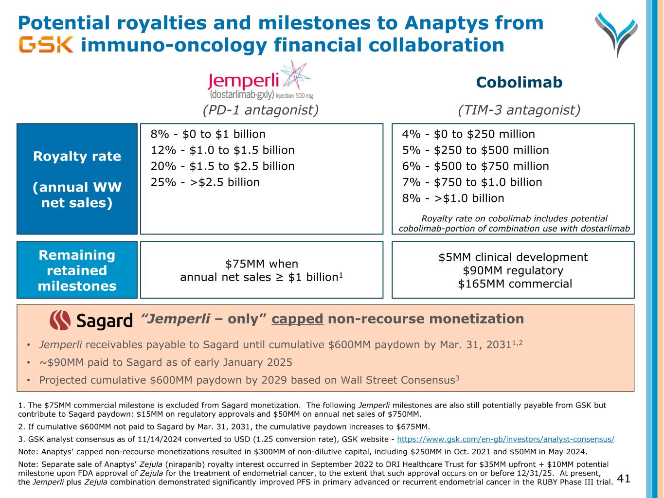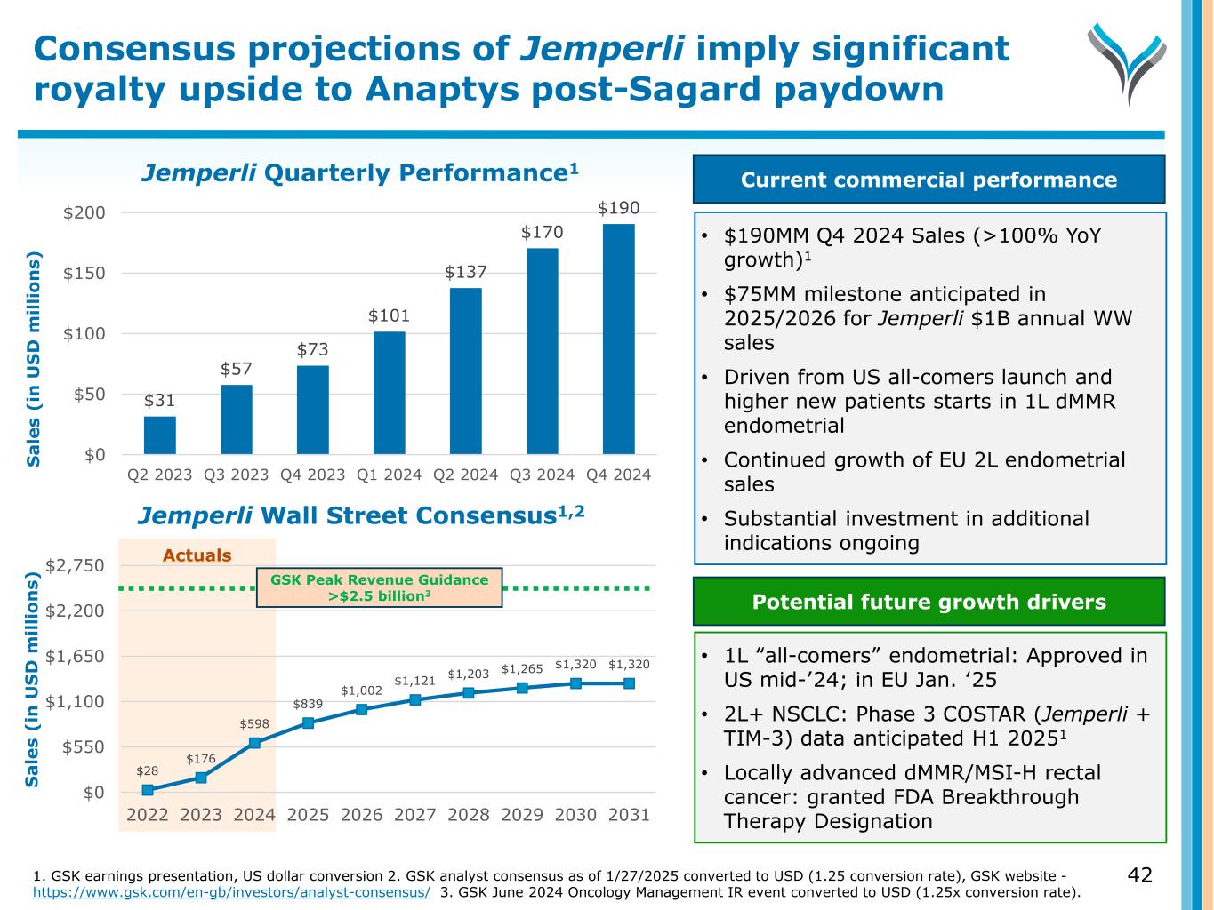 $31 $57 $73 $101 $137 $170 $190 $0 $50 $100 $150 $200 Q2 2023 Q3 2023 Q4 2023 Q1 2024 Q2 2024 Q3 2024 Q4 2024 S a le s (i n U S D m il li o n s) Jemperli Quarterly Performance1 Consensus projections of Jemperli imply significant royalty upside to Anaptys post-Sagard paydown 1. GSK earnings presentation, US dollar conversion 2. GSK analyst consensus as of 1/27/2025 converted to USD (1.25 conversion rate), GSK website - https://www.gsk.com/en-gb/investors/analyst-consensus/ 3. GSK June 2024 Oncology Management IR event converted to USD (1.25x conversion rate). Current commercial performance Potential future growth drivers • $190MM Q4 2024 Sales (>100% YoY growth)1 • $75MM milestone anticipated in 2025/2026 for Jemperli $1B annual WW sales • Driven from US all-comers launch and higher new patients starts in 1L dMMR endometrial • Continued growth of EU 2L endometrial sales • Substantial investment in additional indications ongoing • 1L “all-comers” endometrial: Approved in US mid-’24; in EU Jan. ‘25 • 2L+ NSCLC: Phase 3 COSTAR (Jemperli + TIM-3) data anticipated H1 20251 • Locally advanced dMMR/MSI-H rectal cancer: granted FDA Breakthrough Therapy Designation 42 Actuals $28 $176 $598 $839 $1,002 $1,121 $1,203 $1,265 $1,320 $1,320 $0 $550 $1,100 $1,650 $2,200 $2,750 2022 2023 2024 2025 2026 2027 2028 2029 2030 2031 S a le s (i n U S D m il li o n s) Jemperli Wall Street Consensus1,2 GSK Peak Revenue Guidance >$2.5 billion3