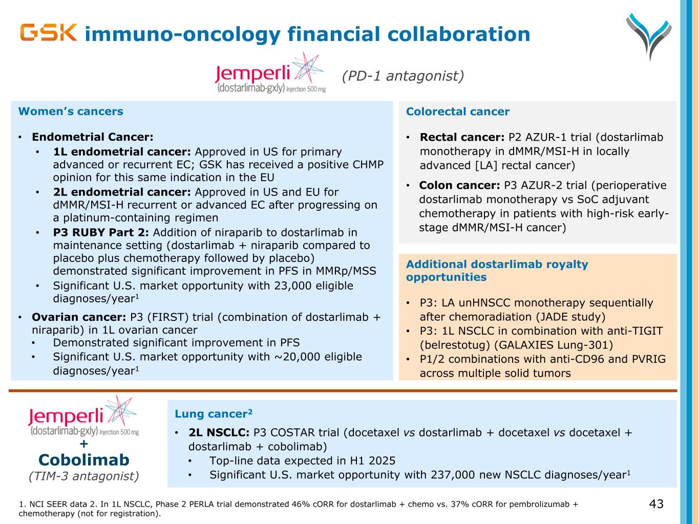 Lung cancer2 • 2L NSCLC: P3 COSTAR trial (docetaxel vs dostarlimab + docetaxel vs docetaxel + dostarlimab + cobolimab) • Top-line data expected in H1 2025 • Significant U.S. market opportunity with 237,000 new NSCLC diagnoses/year1 Additional dostarlimab royalty opportunities • P3: LA unHNSCC monotherapy sequentially after chemoradiation (JADE study) • P3: 1L NSCLC in combination with anti-TIGIT (belrestotug) (GALAXIES Lung-301) • P1/2 combinations with anti-CD96 and PVRIG across multiple solid tumors immuno-oncology financial collaboration + Cobolimab (TIM-3 antagonist) Colorectal cancer • Rectal cancer: P2 AZUR-1 trial (dostarlimab monotherapy in dMMR/MSI-H in locally advanced [LA] rectal cancer) • Colon cancer: P3 AZUR-2 trial (perioperative dostarlimab monotherapy vs SoC adjuvant chemotherapy in patients with high-risk early- stage dMMR/MSI-H cancer) 1. NCI SEER data 2. In 1L NSCLC, Phase 2 PERLA trial demonstrated 46% cORR for dostarlimab + chemo vs. 37% cORR for pembrolizumab + chemotherapy (not for registration). 43 Women’s cancers • Endometrial Cancer: • 1L endometrial cancer: Approved in US for primary advanced or recurrent EC; GSK has received a positive CHMP opinion for this same indication in the EU • 2L endometrial cancer: Approved in US and EU for dMMR/MSI-H recurrent or advanced EC after progressing on a platinum-containing regimen • P3 RUBY Part 2: Addition of niraparib to dostarlimab in maintenance setting (dostarlimab + niraparib compared to placebo plus chemotherapy followed by placebo) demonstrated significant improvement in PFS in MMRp/MSS • Significant U.S. market opportunity with 23,000 eligible diagnoses/year1 • Ovarian cancer: P3 (FIRST) trial (combination of dostarlimab + niraparib) in 1L ovarian cancer • Demonstrated significant improvement in PFS • Significant U.S. market opportunity with ~20,000 eligible diagnoses/year1 (PD-1 antagonist)
