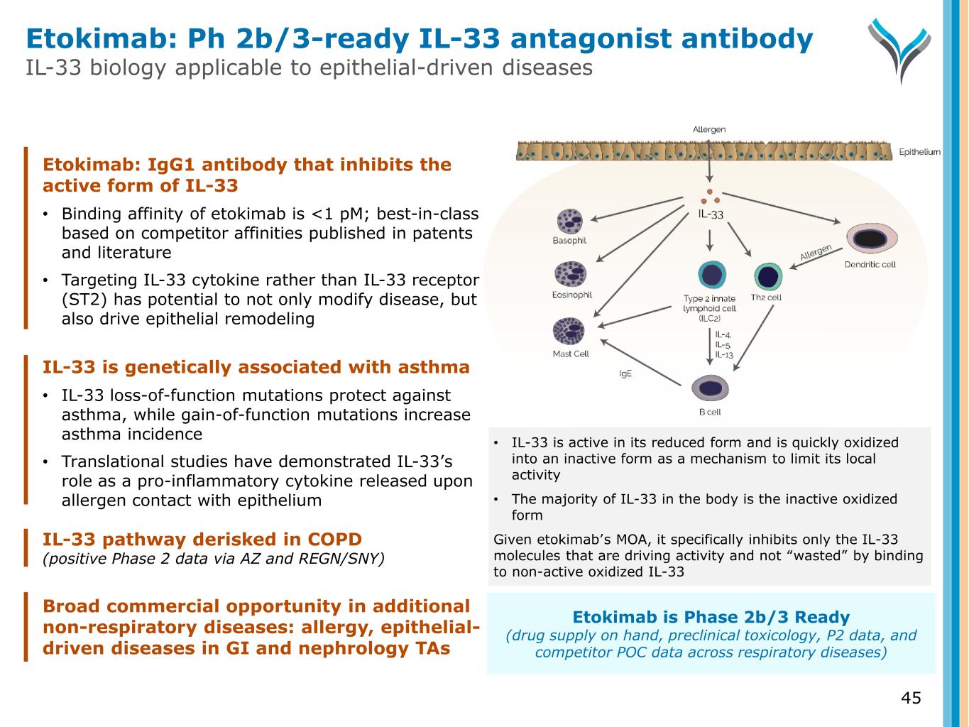 Etokimab: IgG1 antibody that inhibits the active form of IL-33 • Binding affinity of etokimab is <1 pM; best-in-class based on competitor affinities published in patents and literature • Targeting IL-33 cytokine rather than IL-33 receptor (ST2) has potential to not only modify disease, but also drive epithelial remodeling IL-33 is genetically associated with asthma • IL-33 loss-of-function mutations protect against asthma, while gain-of-function mutations increase asthma incidence • Translational studies have demonstrated IL-33’s role as a pro-inflammatory cytokine released upon allergen contact with epithelium IL-33 pathway derisked in COPD (positive Phase 2 data via AZ and REGN/SNY) Broad commercial opportunity in additional non-respiratory diseases: allergy, epithelial- driven diseases in GI and nephrology TAs 45 • IL-33 is active in its reduced form and is quickly oxidized into an inactive form as a mechanism to limit its local activity • The majority of IL-33 in the body is the inactive oxidized form Given etokimab’s MOA, it specifically inhibits only the IL-33 molecules that are driving activity and not “wasted” by binding to non-active oxidized IL-33 Etokimab is Phase 2b/3 Ready (drug supply on hand, preclinical toxicology, P2 data, and competitor POC data across respiratory diseases) Etokimab: Ph 2b/3-ready IL-33 antagonist antibody IL-33 biology applicable to epithelial-driven diseases 45