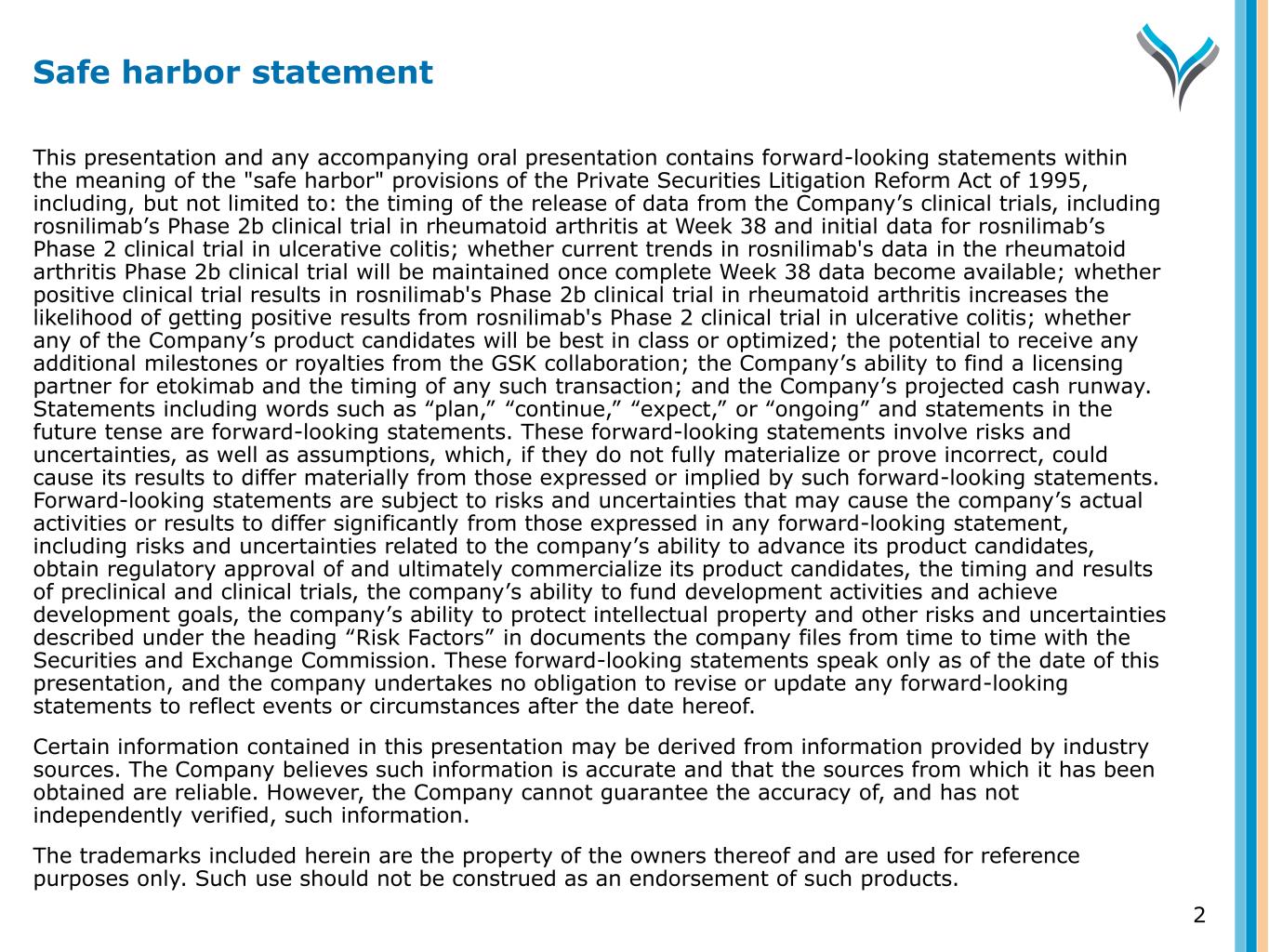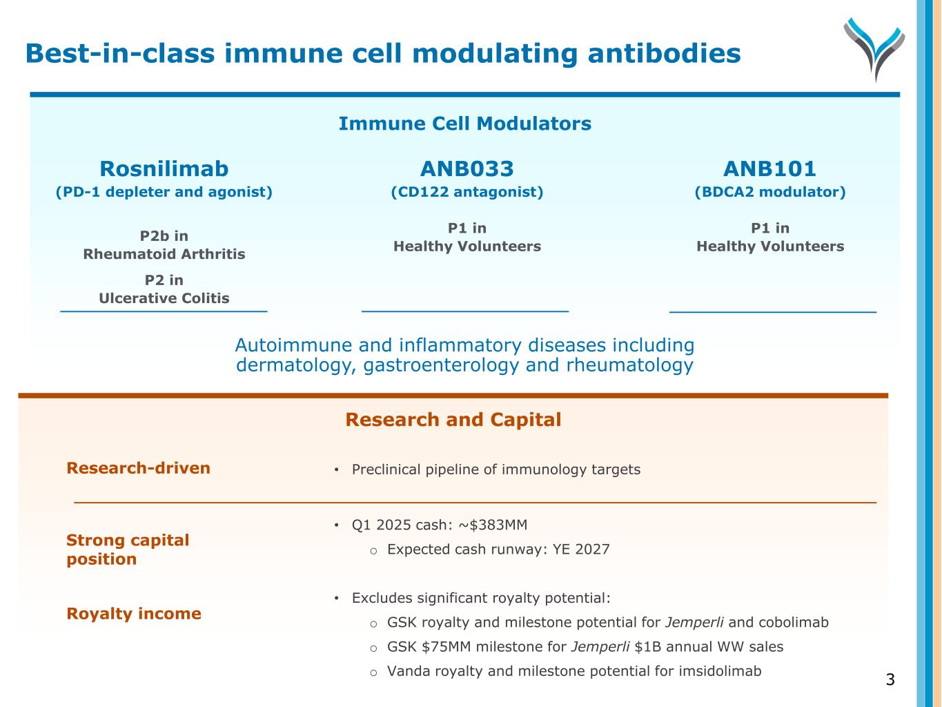 This presentation and any accompanying oral presentation contains forward-looking statements within the meaning of the "safe harbor" provisions of the Private Securities Litigation Reform Act of 1995, including, but not limited to: the timing of the release of data from the Company’s clinical trials, including rosnilimab’s Phase 2b clinical trial in rheumatoid arthritis at Week 38 and initial data for rosnilimab’s Phase 2 clinical trial in ulcerative colitis; whether current trends in rosnilimab's data in the rheumatoid arthritis Phase 2b clinical trial will be maintained once complete Week 38 data become available; whether positive clinical trial results in rosnilimab's Phase 2b clinical trial in rheumatoid arthritis increases the likelihood of getting positive results from rosnilimab's Phase 2 clinical trial in ulcerative colitis; whether any of the Company’s product candidates will be best in class or optimized; the potential to receive any additional milestones or royalties from the GSK collaboration; the Company’s ability to find a licensing partner for etokimab and the timing of any such transaction; and the Company’s projected cash runway. Statements including words such as “plan,” “continue,” “expect,” or “ongoing” and statements in the future tense are forward-looking statements. These forward-looking statements involve risks and uncertainties, as well as assumptions, which, if they do not fully materialize or prove incorrect, could cause its results to differ materially from those expressed or implied by such forward-looking statements. Forward-looking statements are subject to risks and uncertainties that may cause the company’s actual activities or results to differ significantly from those expressed in any forward-looking statement, including risks and uncertainties related to the company’s ability to advance its product candidates, obtain regulatory approval of and ultimately commercialize its product candidates, the timing and results of preclinical and clinical trials, the company’s ability to fund development activities and achieve development goals, the company’s ability to protect intellectual property and other risks and uncertainties described under the heading “Risk Factors” in documents the company files from time to time with the Securities and Exchange Commission. These forward-looking statements speak only as of the date of this presentation, and the company undertakes no obligation to revise or update any forward-looking statements to reflect events or circumstances after the date hereof. Certain information contained in this presentation may be derived from information provided by industry sources. The Company believes such information is accurate and that the sources from which it has been obtained are reliable. However, the Company cannot guarantee the accuracy of, and has not independently verified, such information. The trademarks included herein are the property of the owners thereof and are used for reference purposes only. Such use should not be construed as an endorsement of such products. 2 Safe harbor statement