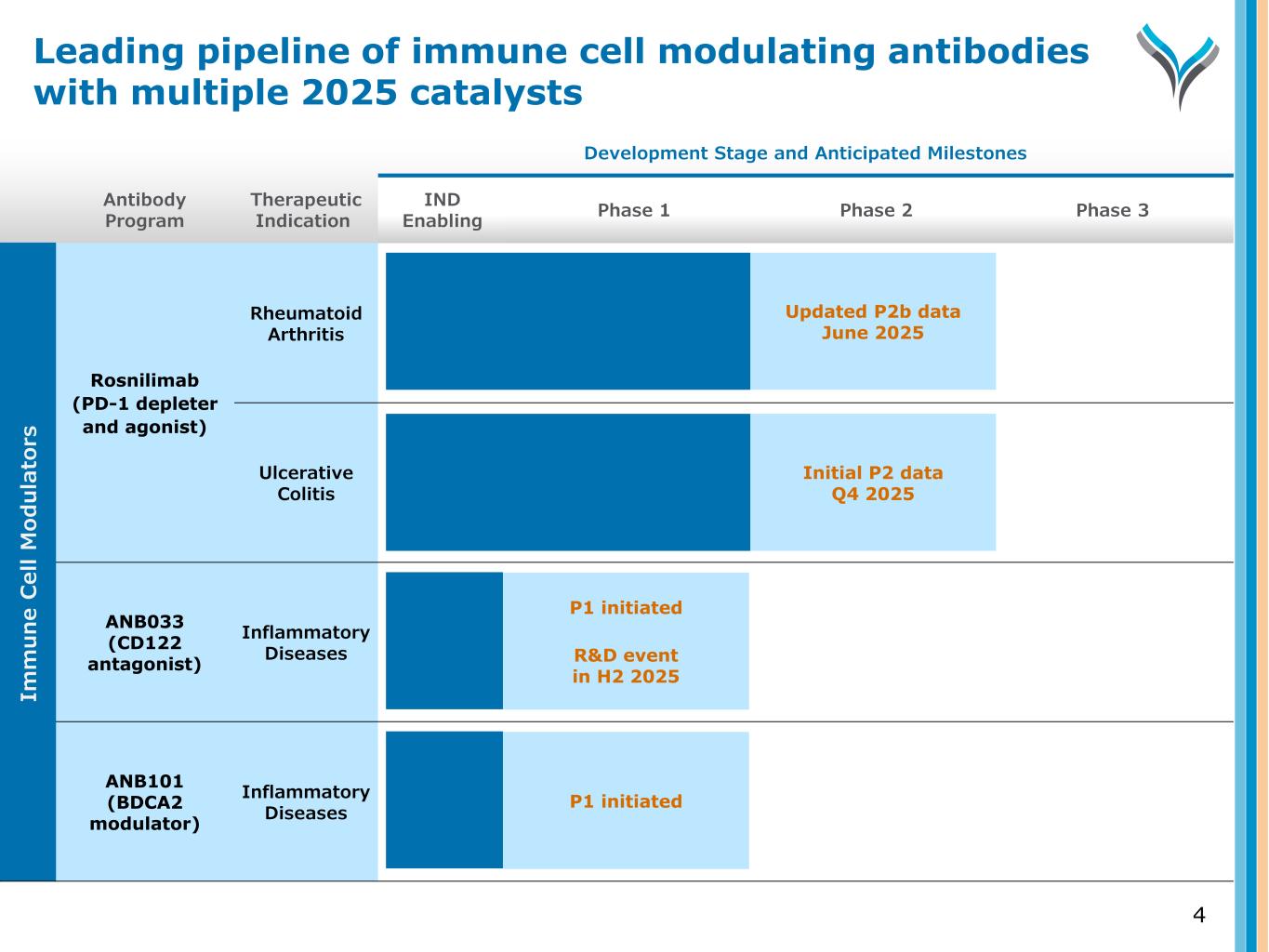 Immune Cell Modulators ANB033 (CD122 antagonist) P1 in Healthy Volunteers Rosnilimab (PD-1 depleter and agonist) P2b in Rheumatoid Arthritis P2 in Ulcerative Colitis Autoimmune and inflammatory diseases including dermatology, gastroenterology and rheumatology ANB101 (BDCA2 modulator) P1 in Healthy Volunteers Research and Capital Strong capital position Research-driven • Q1 2025 cash: ~$383MM o Expected cash runway: YE 2027 • Excludes significant royalty potential: o GSK royalty and milestone potential for Jemperli and cobolimab o GSK $75MM milestone for Jemperli $1B annual WW sales o Vanda royalty and milestone potential for imsidolimab • Preclinical pipeline of immunology targets Royalty income Best-in-class immune cell modulating antibodies 3