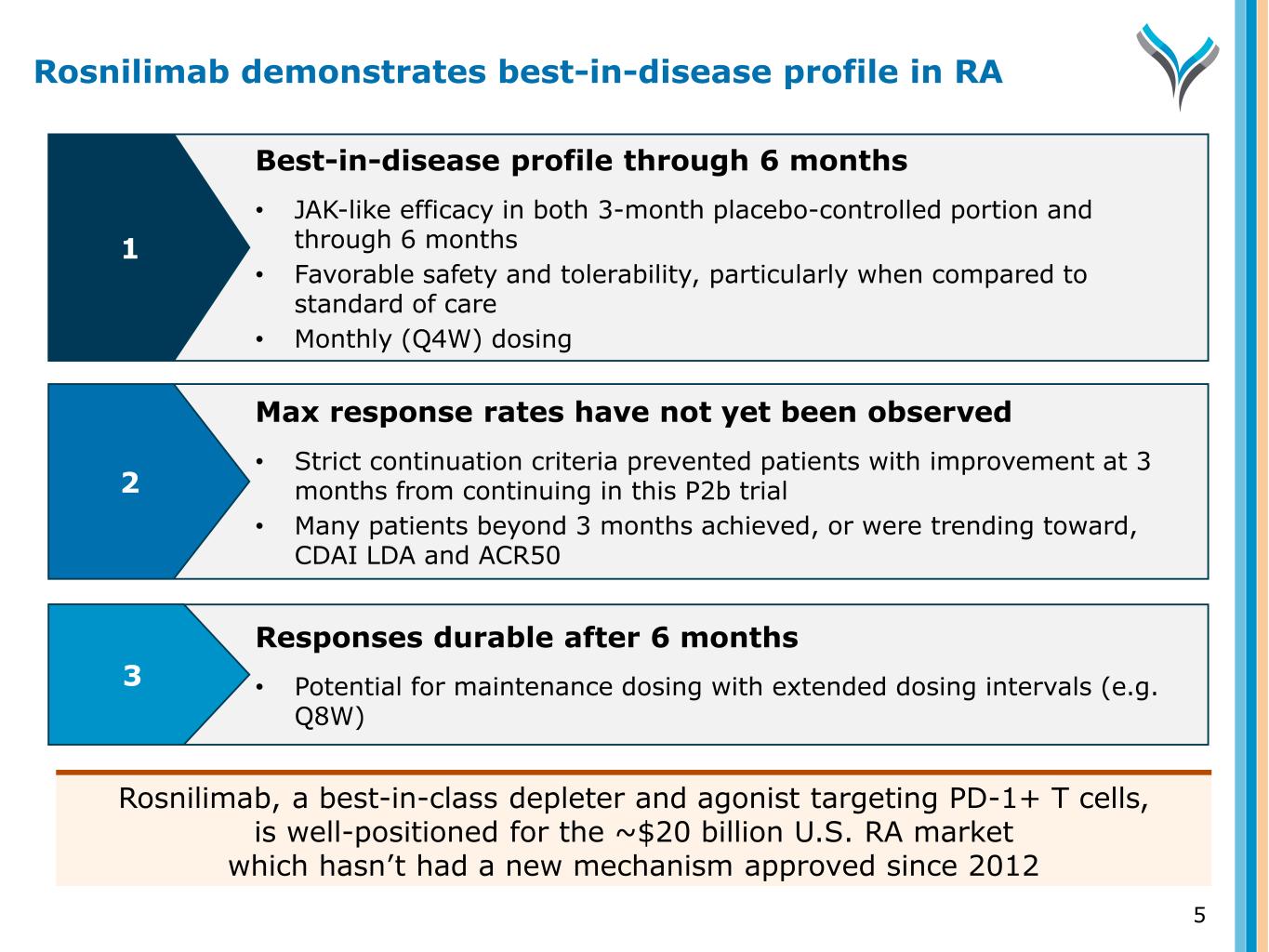 Antibody Program Therapeutic Indication Development Stage and Anticipated Milestones IND Enabling Phase 1 Phase 2 Phase 3 Rosnilimab (PD-1 depleter and agonist) Rheumatoid Arthritis Ulcerative Colitis ANB033 (CD122 antagonist) Inflammatory Diseases ANB101 (BDCA2 modulator) Inflammatory Diseases 4 Updated P2b data June 2025 Initial P2 data Q4 2025 P1 initiated R&D event in H2 2025 I m m u n e C e ll M o d u la to rs P1 initiated Leading pipeline of immune cell modulating antibodies with multiple 2025 catalysts