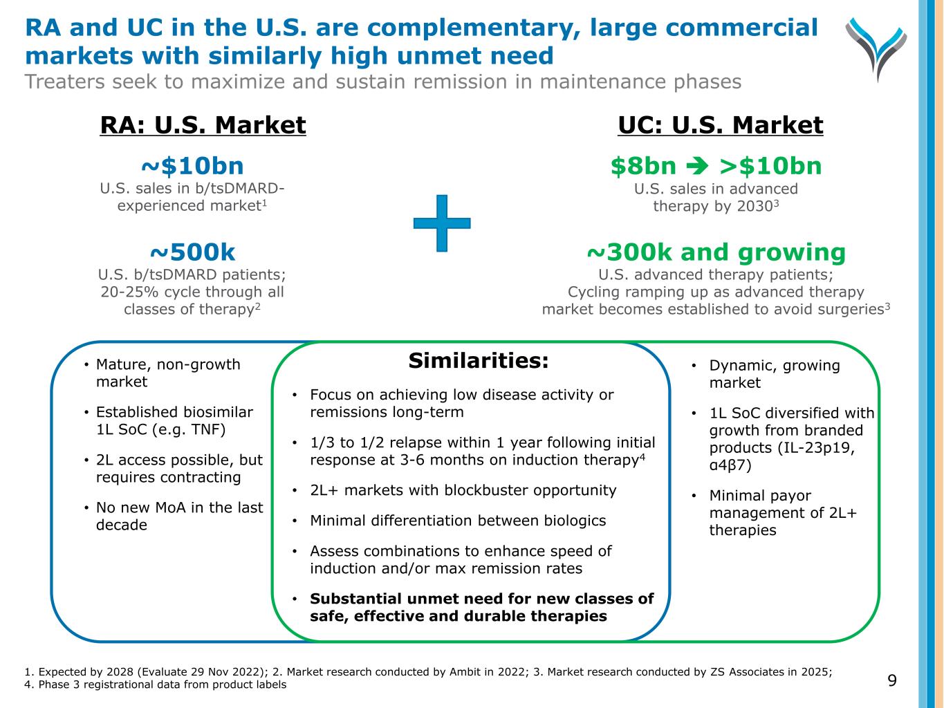 Similarities: • Focus on achieving low disease activity or remissions long-term • 1/3 to 1/2 relapse within 1 year following initial response at 3-6 months on induction therapy4 • 2L+ markets with blockbuster opportunity • Minimal differentiation between biologics • Assess combinations to enhance speed of induction and/or max remission rates • Substantial unmet need for new classes of safe, effective and durable therapies • Mature, non-growth market • Established biosimilar 1L SoC (e.g. TNF) • 2L access possible, but requires contracting • No new MoA in the last decade • Dynamic, growing market • 1L SoC diversified with growth from branded products (IL-23p19, α4β7) • Minimal payor management of 2L+ therapies ~$10bn U.S. sales in b/tsDMARD- experienced market1 $8bn ➔ >$10bn U.S. sales in advanced therapy by 20303 ~500k U.S. b/tsDMARD patients; 20-25% cycle through all classes of therapy2 ~300k and growing U.S. advanced therapy patients; Cycling ramping up as advanced therapy market becomes established to avoid surgeries3 RA: U.S. Market UC: U.S. Market 1. Expected by 2028 (Evaluate 29 Nov 2022); 2. Market research conducted by Ambit in 2022; 3. Market research conducted by ZS Associates in 2025; 4. Phase 3 registrational data from product labels RA and UC in the U.S. are complementary, large commercial markets with similarly high unmet need Treaters seek to maximize and sustain remission in maintenance phases 9