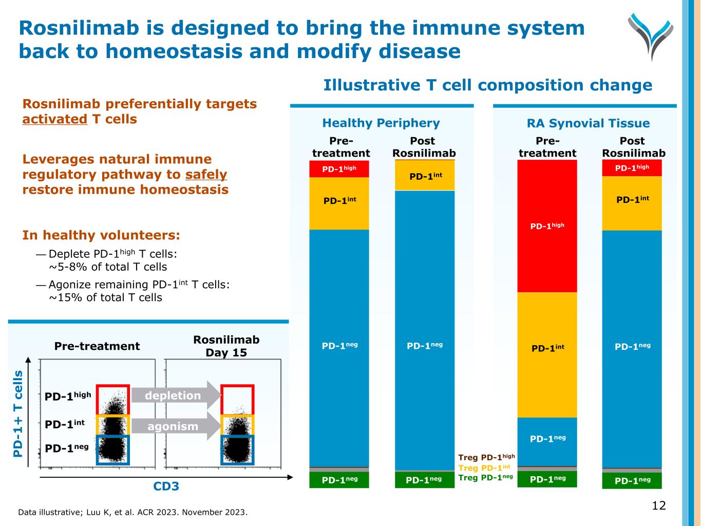 11 Dendritic cell T cell T cell Activation MHCCD80/86 SHP2 TCRCD28 P PD-1 PD-L1 Rosnilimab Fc Receptor Rapidly engage homeostatic mechanisms to induce clinical response1 2 Rosnilimab aims to: Immune Cells Impacted Mechanism Immunologic Outcome PD-1high Tfh/Tph depletes downstream effect on B cells Plasma cell generation Autoantibody levels PD-1high Teff depletes Cytokine secretion T cell migration T cell proliferation PD-1+ Teff agonizes Cytokine secretion T cell migration T cell proliferation Achieve durable remission Rosnilimab selectively targets activated PD-1+ T cells in the periphery and inflamed tissue Effector T cells (Teff): activated T cells (cytotoxic, helper, Treg); Follicular/Peripheral Helper T cells (Tfh, Tph): support B cell differentiation and maturation.