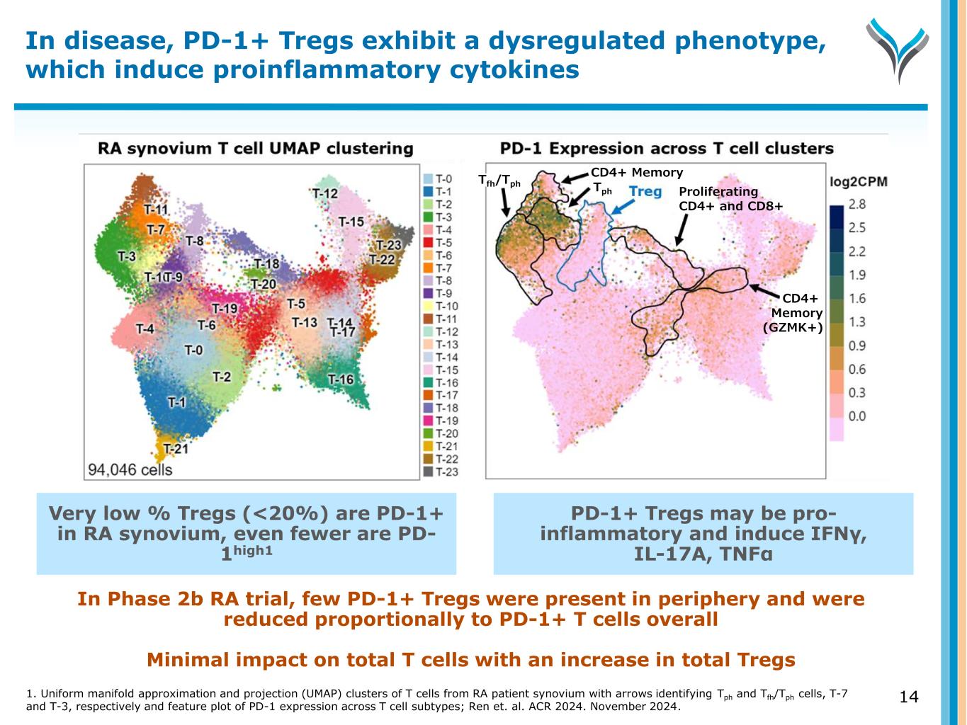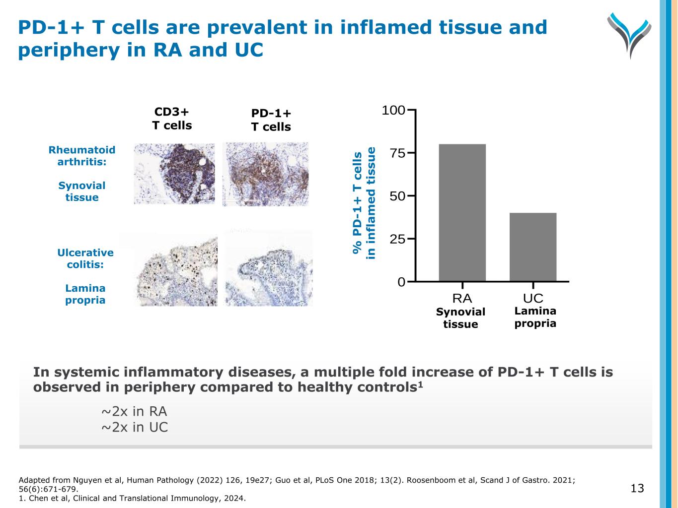 Adapted from Nguyen et al, Human Pathology (2022) 126, 19e27; Guo et al, PLoS One 2018; 13(2). Roosenboom et al, Scand J of Gastro. 2021; 56(6):671-679. 1. Chen et al, Clinical and Translational Immunology, 2024. 13 PD-1+ T cells are prevalent in inflamed tissue and periphery in RA and UC RA UC AA 0 25 50 75 100 % P D -1 + T c e ll s in i n fl a m e d t is s u e Synovial tissue Lamina propria Hair follicle Rheumatoid arthritis: Synovial tissue Ulcerative colitis: Lamina propria CD3+ T cells PD-1+ T cells In systemic inflammatory diseases, a multiple fold increase of PD-1+ T cells is observed in periphery compared to healthy controls1 ~2x in RA ~2x in UC % P D -1 + T c e ll s in i n fl a m e d t is s u e