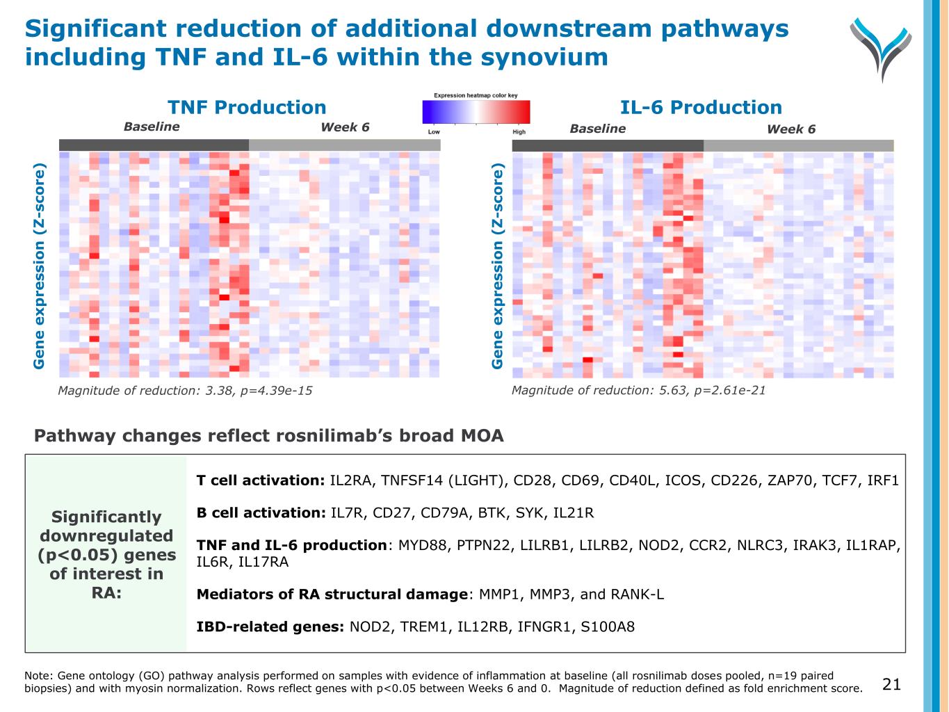 Fold decrease: 4.03, p=1.09e-24 T Cell Activation Fold decrease: 4.06, p=1.77e-18 B Cell Activation G e n e e x p r e s s io n ( Z -s c o r e ) G e n e e x p r e s s io n ( Z -s c o r e ) 5.5 2.9 2.0 0 2 4 6 8 6.1 3.9 1.0 0 2 4 6 8 M a g n it u d e o f r e d u c ti o n Magnitude of reduction: 4.03, p=1.09e-24 Magnitude of reduction: 4.06, p=1.77e-18 Rosnilimab Wk12 CDAI Responders Rosnilimab Wk12 CDAI Non-responders Placebo Rosnilimab Wk12 CDAI Responders Rosnilimab Wk12 CDAI Non-responders Placebo Week 6 *** *** *** *** *** *** M a g n it u d e o f r e d u c ti o n Week 6BaselineBaseline Significant reduction of T and B cell activation demonstrate on target pharmacology within the synovium Note: Gene ontology (GO) pathway analysis performed on samples with evidence of inflammation at baseline (all rosnilimab doses pooled, n=19 paired biopsies) and with myosin normalization. Rows reflect genes with p<0.05 between Weeks 6 and 0. Magnitude of reduction defined as fold enrichment score. Rosnilimab responders achieved CDAI LDA in 3 months. ***p<0.001 for difference in fold change between baseline and Week 6 between groups. 20