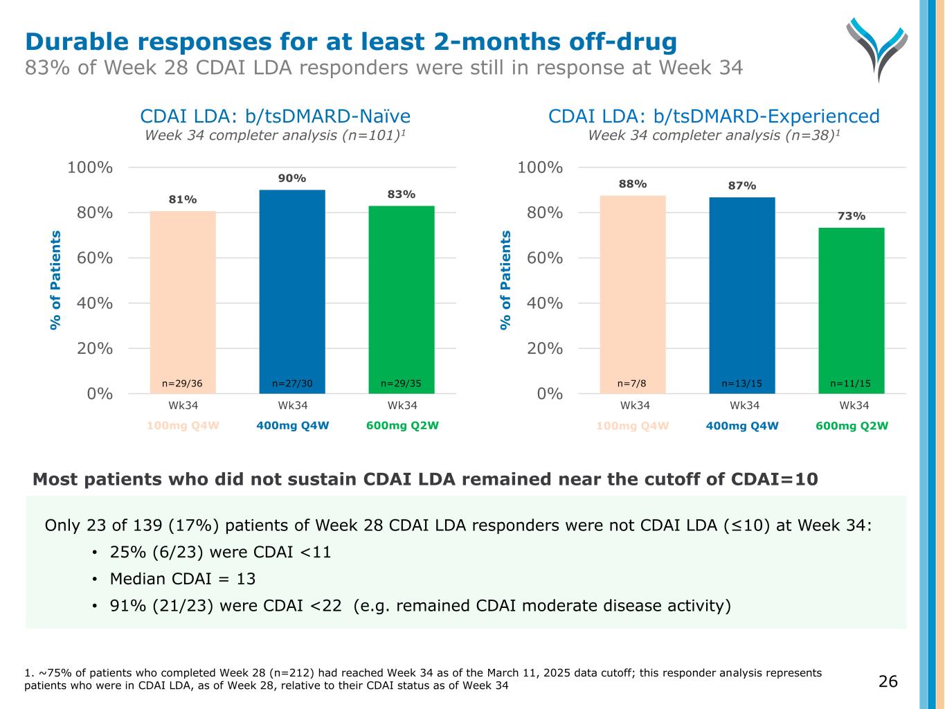 81% 90% 83% 0% 20% 40% 60% 80% 100% % o f P a ti e n ts CDAI LDA: b/tsDMARD-Naïve Week 34 completer analysis (n=101)1 CDAI LDA: b/tsDMARD-Experienced Week 34 completer analysis (n=38)1 Wk34 Wk34 Wk34 88% 87% 73% 0% 20% 40% 60% 80% 100% % o f P a ti e n ts Wk34 Wk34 Wk34 n=29/36 n=27/30 n=29/35 n=7/8 n=13/15 n=11/15 26 Only 23 of 139 (17%) patients of Week 28 CDAI LDA responders were not CDAI LDA (≤10) at Week 34: • 25% (6/23) were CDAI <11 • Median CDAI = 13 • 91% (21/23) were CDAI <22 (e.g. remained CDAI moderate disease activity) Most patients who did not sustain CDAI LDA remained near the cutoff of CDAI=10 100mg Q4W 400mg Q4W 600mg Q2W 100mg Q4W 400mg Q4W 600mg Q2W Durable responses for at least 2-months off-drug 83% of Week 28 CDAI LDA responders were still in response at Week 34 1. ~75% of patients who completed Week 28 (n=212) had reached Week 34 as of the March 11, 2025 data cutoff; this responder analysis represents patients who were in CDAI LDA, as of Week 28, relative to their CDAI status as of Week 34
