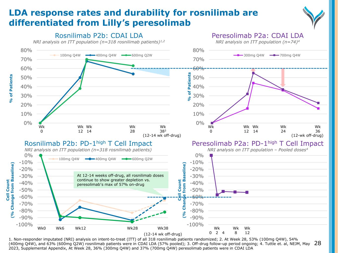 -37.3 -42.6 -42.8 -47.0 -49.9 -52.4 -60 -50 -40 -30 -20 -10 0 M e a n C h a n g e P a in V A S Pain VAS: Overall MMRM analysis on CDAI Responder Population (n=220)1 Wk 12 Wk 28 Rosnilimab - 100mg Q4W Rosnilimab - 400mg Q4W Rosnilimab - 600mg Q2W 1. Mixed Model for Repeated Measures (MMRM) analysis on rosnilimab CDAI LDA responder at Week 14 population (n=220) includes naïve population (n=46 100mg Q4W, n=40 400mg Q4W, n=48 600mg Q2W; n=134 total rosnilimab patients) and experienced population (n=27 100mg Q4W, n=33 400mg Q4W, n=26 600mg Q2W; n=86 total rosnilimab patients); 2. Behrens et. al, BMC Rheumatology, Dec. 2019; 3. Strand et. al, Journal of Rheumatology, Aug. 2011 Wk 12 Wk 28 Wk 12 Wk 28 -10.5 -10.1 -6.1 -7.7 -12.9 -7.0 -15 -10 -5 0 M e a n C h a n g e i n C R P Wk 12 Wk 28 Wk 12 Wk 28 Wk 12 Wk 28 -0.7 -0.7 -0.6 -0.9 -0.9 -0.9 -1.0 -0.9 -0.8 -0.7 -0.6 -0.5 -0.4 -0.3 -0.2 -0.1 0.0 M e a n C h a n g e i n H A Q -D I HAQ-DI: Overall MMRM analysis on CDAI Responder Population (n=220)1 Wk 12 Wk 28 Wk 12 Wk 28 Wk 12 Wk 28 25 CRP: Overall MMRM analysis on CDAI Responder Population (n=220)1 Highly meaningful clinically and symptomatic improvement across multiple PROs and CRP MCID: -0.22 from baseline2 MCID: -10 from baseline3