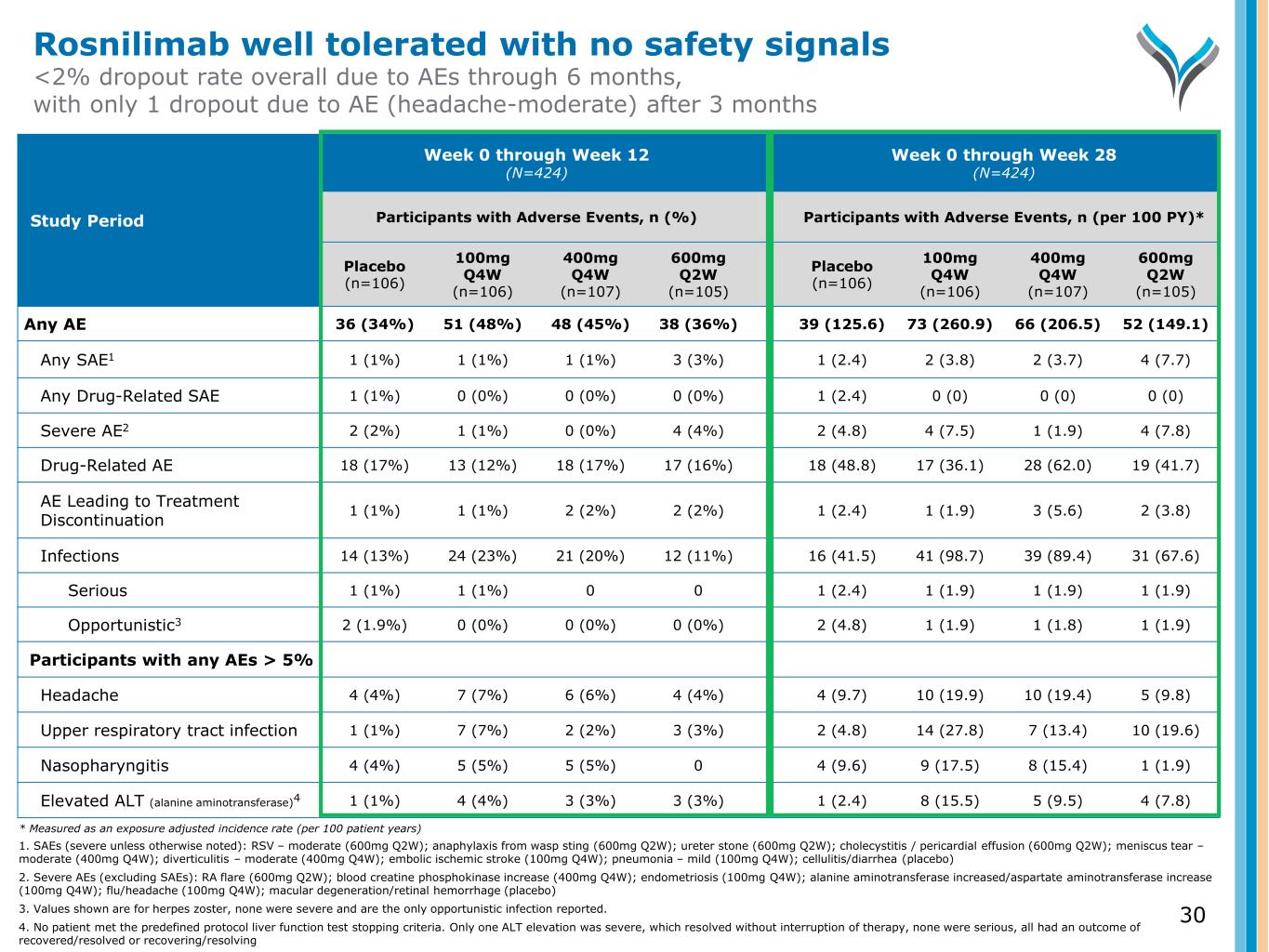 30 Study Period Week 0 through Week 12 (N=424) Week 0 through Week 28 (N=424) Participants with Adverse Events, n (%) Participants with Adverse Events, n (per 100 PY)* Placebo (n=106) 100mg Q4W (n=106) 400mg Q4W (n=107) 600mg Q2W (n=105) Placebo (n=106) 100mg Q4W (n=106) 400mg Q4W (n=107) 600mg Q2W (n=105) Any AE 36 (34%) 51 (48%) 48 (45%) 38 (36%) 39 (125.6) 73 (260.9) 66 (206.5) 52 (149.1) Any SAE1 1 (1%) 1 (1%) 1 (1%) 3 (3%) 1 (2.4) 2 (3.8) 2 (3.7) 4 (7.7) Any Drug-Related SAE 1 (1%) 0 (0%) 0 (0%) 0 (0%) 1 (2.4) 0 (0) 0 (0) 0 (0) Severe AE2 2 (2%) 1 (1%) 0 (0%) 4 (4%) 2 (4.8) 4 (7.5) 1 (1.9) 4 (7.8) Drug-Related AE 18 (17%) 13 (12%) 18 (17%) 17 (16%) 18 (48.8) 17 (36.1) 28 (62.0) 19 (41.7) AE Leading to Treatment Discontinuation 1 (1%) 1 (1%) 2 (2%) 2 (2%) 1 (2.4) 1 (1.9) 3 (5.6) 2 (3.8) Infections 14 (13%) 24 (23%) 21 (20%) 12 (11%) 16 (41.5) 41 (98.7) 39 (89.4) 31 (67.6) Serious 1 (1%) 1 (1%) 0 0 1 (2.4) 1 (1.9) 1 (1.9) 1 (1.9) Opportunistic3 2 (1.9%) 0 (0%) 0 (0%) 0 (0%) 2 (4.8) 1 (1.9) 1 (1.8) 1 (1.9) Participants with any AEs > 5% Headache 4 (4%) 7 (7%) 6 (6%) 4 (4%) 4 (9.7) 10 (19.9) 10 (19.4) 5 (9.8) Upper respiratory tract infection 1 (1%) 7 (7%) 2 (2%) 3 (3%) 2 (4.8) 14 (27.8) 7 (13.4) 10 (19.6) Nasopharyngitis 4 (4%) 5 (5%) 5 (5%) 0 4 (9.6) 9 (17.5) 8 (15.4) 1 (1.9) Elevated ALT (alanine aminotransferase)4 1 (1%) 4 (4%) 3 (3%) 3 (3%) 1 (2.4) 8 (15.5) 5 (9.5) 4 (7.8) Rosnilimab well tolerated with no safety signals <2% dropout rate overall due to AEs through 6 months, with only 1 dropout due to AE (headache-moderate) after 3 months * Measured as an exposure adjusted incidence rate (per 100 patient years) 1. SAEs (severe unless otherwise noted): RSV – moderate (600mg Q2W); anaphylaxis from wasp sting (600mg Q2W); ureter stone (600mg Q2W); cholecystitis / pericardial effusion (600mg Q2W); meniscus tear – moderate (400mg Q4W); diverticulitis – moderate (400mg Q4W); embolic ischemic stroke (100mg Q4W); pneumonia – mild (100mg Q4W); cellulitis/diarrhea (placebo) 2. Severe AEs (excluding SAEs): RA flare (600mg Q2W); blood creatine phosphokinase increase (400mg Q4W); endometriosis (100mg Q4W); alanine aminotransferase increased/aspartate aminotransferase increase (100mg Q4W); flu/headache (100mg Q4W); macular degeneration/retinal hemorrhage (placebo) 3. Values shown are for herpes zoster, none were severe and are the only opportunistic infection reported. 4. No patient met the predefined protocol liver function test stopping criteria. Only one ALT elevation was severe, which resolved without interruption of therapy, none were serious, all had an outcome of recovered/resolved or recovering/resolving