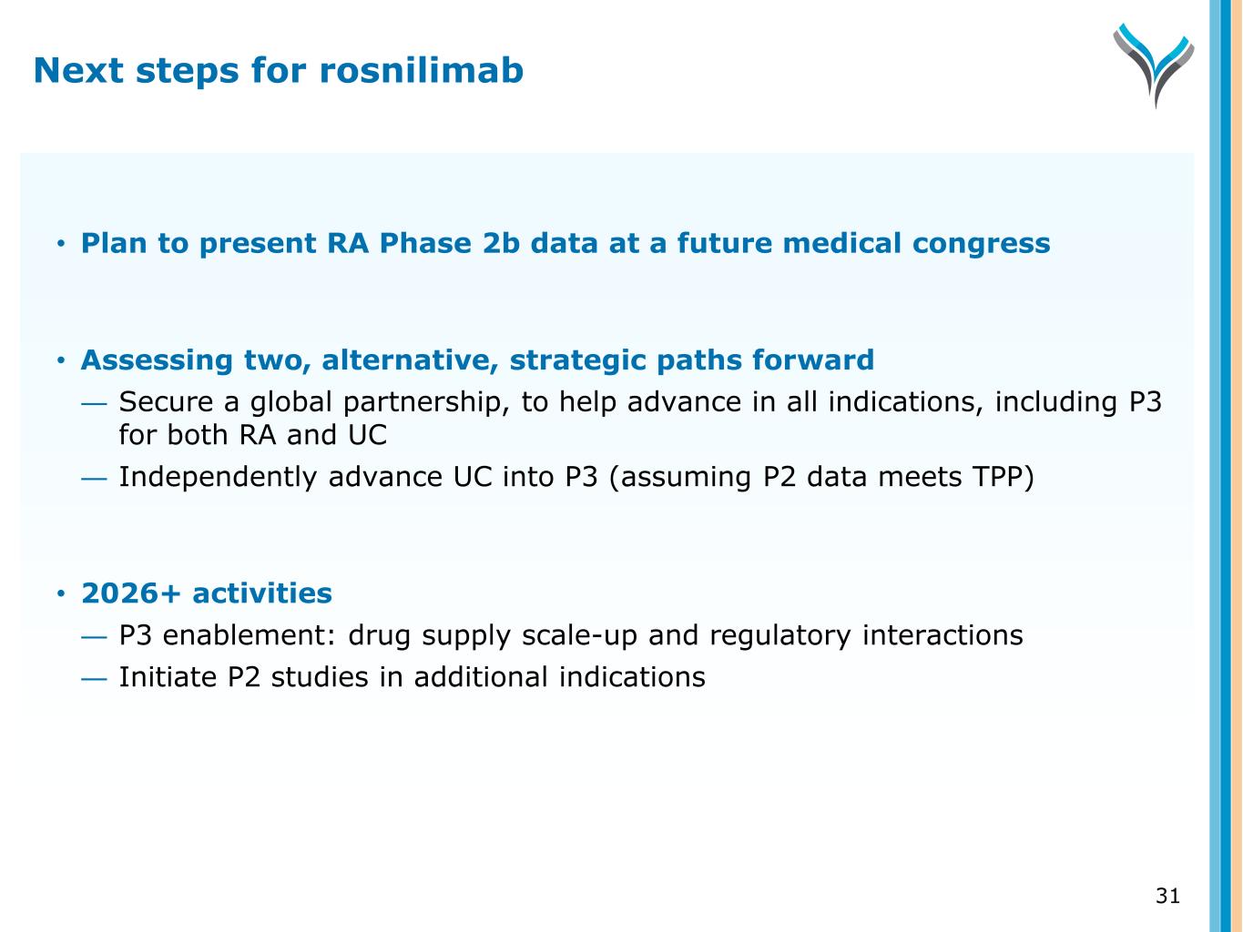 31 Next steps for rosnilimab • Plan to present RA Phase 2b data at a future medical congress • Assessing two, alternative, strategic paths forward ― Secure a global partnership, to help advance in all indications, including P3 for both RA and UC ― Independently advance UC into P3 (assuming P2 data meets TPP) • 2026+ activities ― P3 enablement: drug supply scale-up and regulatory interactions ― Initiate P2 studies in additional indications