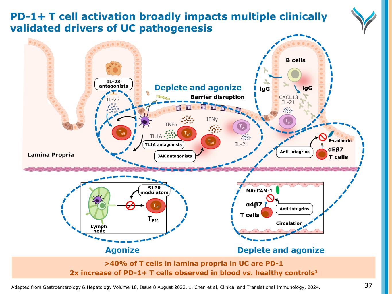 Adapted from Gastroenterology & Hepatology Volume 18, Issue 8 August 2022. 1. Chen et al, Clinical and Translational Immunology, 2024. 37 >40% of T cells in lamina propria in UC are PD-1 2x increase of PD-1+ T cells observed in blood vs. healthy controls1 B cells IL-23 antagonists αEβ7 Lymph node S1PR modulators TEff MAdCAM-1 Anti-integrins α4β7 Circulation Anti-integrins E-cadherin IFNγ IL-21 T cells T cells CXCL13 IL-21 JAK antagonists lgGlgG Barrier disruption TNF IL-23 TL1A TL1A antagonists Teff Teff Teff Teff Agonize Deplete and agonize Deplete and agonize Tph Tph Lamina Propria PD-1+ T cell activation broadly impacts multiple clinically validated drivers of UC pathogenesis