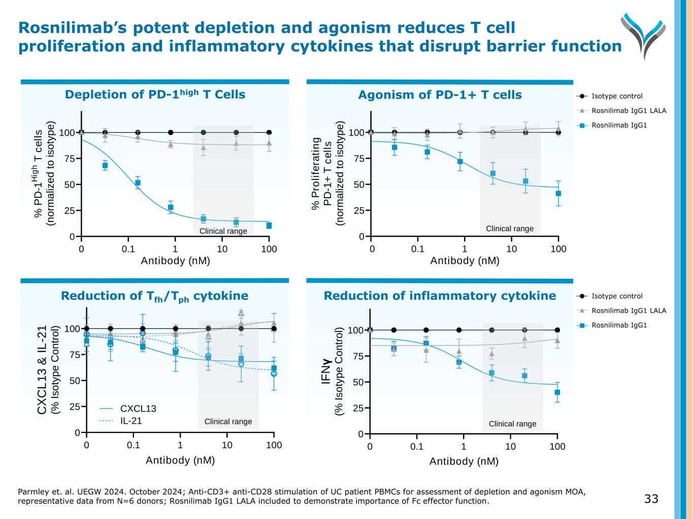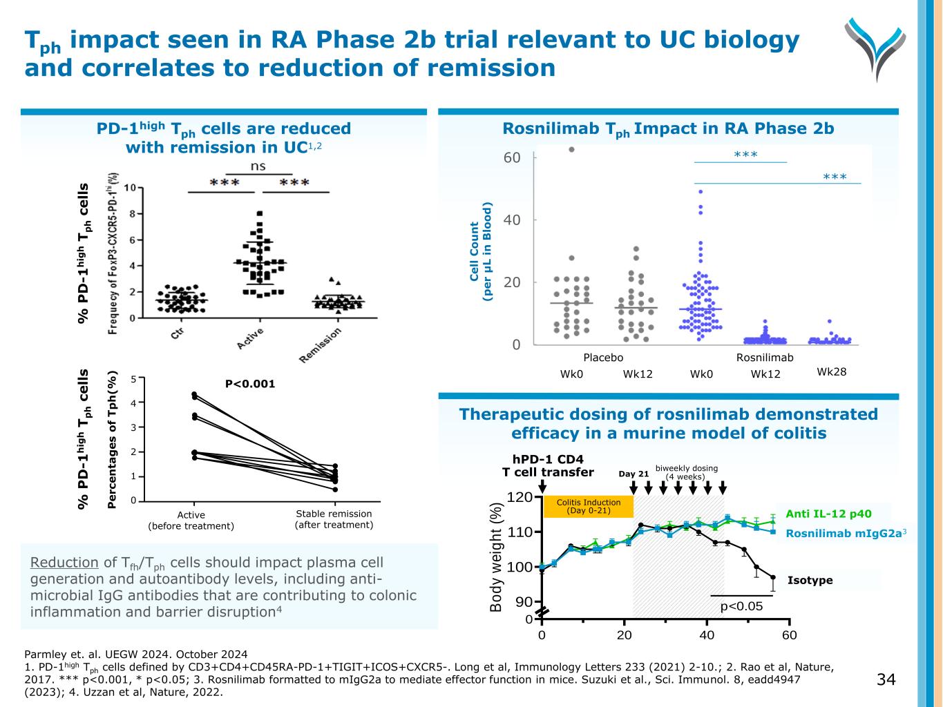Reduction of Tfh/Tph cytokine 0 25 50 75 100 0 0.1 1 10 100 Antibody (nM) C X C L 1 3 & I L -2 1 (% I s o ty p e C o n tr o l) IL-21 CXCL13 Clinical range Reduction of inflammatory cytokine Agonism of PD-1+ T cellsDepletion of PD-1high T Cells Parmley et. al. UEGW 2024. October 2024; Anti-CD3+ anti-CD28 stimulation of UC patient PBMCs for assessment of depletion and agonism MOA, representative data from N=6 donors; Rosnilimab IgG1 LALA included to demonstrate importance of Fc effector function. 33 Rosnilimab’s potent depletion and agonism reduces T cell proliferation and inflammatory cytokines that disrupt barrier function 0.1 1 10 100 0 25 50 75 100 Antibody (nM) % P D -1 H ig h T c e ll s (n o rm a liz e d t o i s o ty p e ) 0 Clinical range 0.1 1 10 100 0 25 50 75 100 Antibody (nM) % P ro li fe ra ti n g P D -1 + T c e ll s (n o rm a liz e d t o i s o ty p e ) 0 Clinical range 0 25 50 75 100 0 0.1 1 10 100 Antibody (nM) IF N γ (% I s o ty p e C o n tr o l) Clinical range Isotype control Rosnilimab IgG1 LALA Rosnilimab IgG1 Isotype control Rosnilimab IgG1 LALA Rosnilimab IgG1