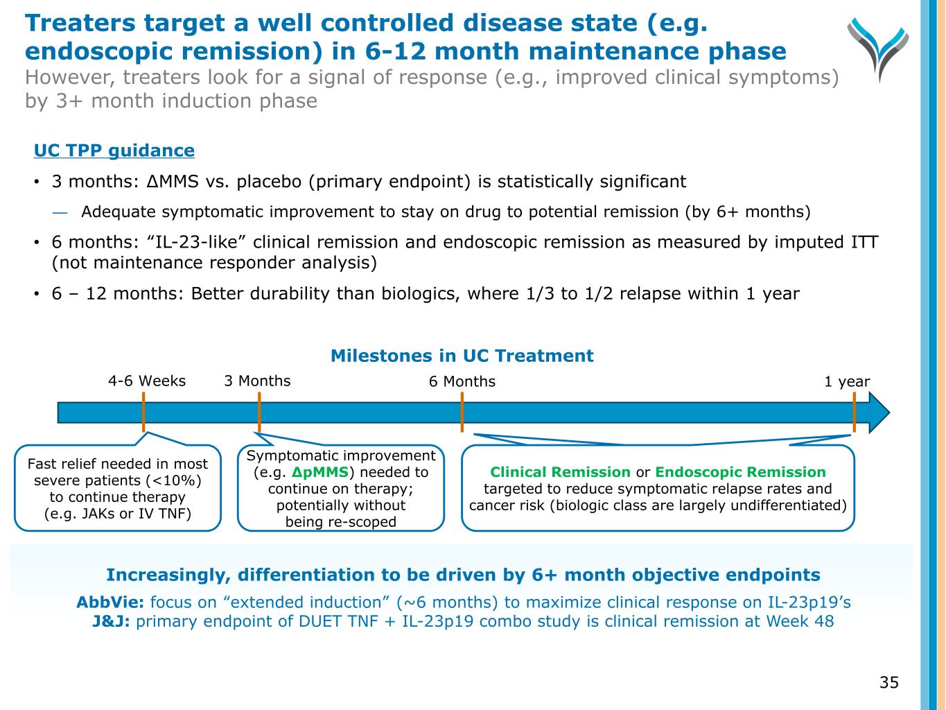 3 Months 6 Months Fast relief needed in most severe patients (<10%) to continue therapy (e.g. JAKs or IV TNF) Symptomatic improvement (e.g. ∆pMMS) needed to continue on therapy; potentially without being re-scoped Clinical Remission or Endoscopic Remission targeted to reduce symptomatic relapse rates and cancer risk (biologic class are largely undifferentiated) Milestones in UC Treatment 1 year4-6 Weeks UC TPP guidance • 3 months: ∆MMS vs. placebo (primary endpoint) is statistically significant ― Adequate symptomatic improvement to stay on drug to potential remission (by 6+ months) • 6 months: “IL-23-like” clinical remission and endoscopic remission as measured by imputed ITT (not maintenance responder analysis) • 6 – 12 months: Better durability than biologics, where 1/3 to 1/2 relapse within 1 year Increasingly, differentiation to be driven by 6+ month objective endpoints AbbVie: focus on “extended induction” (~6 months) to maximize clinical response on IL-23p19’s J&J: primary endpoint of DUET TNF + IL-23p19 combo study is clinical remission at Week 48 Treaters target a well controlled disease state (e.g. endoscopic remission) in 6-12 month maintenance phase However, treaters look for a signal of response (e.g., improved clinical symptoms) by 3+ month induction phase 35