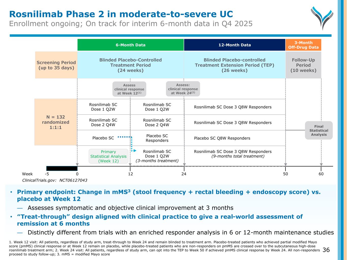 Rosnilimab Phase 2 in moderate-to-severe UC Enrollment ongoing; On track for interim 6-month data in Q4 2025 Blinded Placebo-controlled Treatment Extension Period (TEP) (26 weeks) Screening Period (up to 35 days) Follow-Up Period (10 weeks) Week -5 0 12 24 Rosnilimab SC Dose 1 Q2W Rosnilimab SC Dose 2 Q4W Placebo SC Rosnilimab SC Dose 1 Q2W Rosnilimab SC Dose 2 Q4W Placebo SC Responders Rosnilimab SC Dose 1 Q2W (3-months treatment) N = 132 randomized 1:1:1 Final Statistical Analysis ClinicalTrials.gov: NCT06127043 Rosnilimab SC Dose 3 Q8W Responders Rosnilimab SC Dose 3 Q8W Responders Placebo SC Q8W Responders Rosnilimab SC Dose 3 Q8W Responders (9-months total treatment) 50 60 Primary Statistical Analysis (Week 12) Blinded Placebo-Controlled Treatment Period (24 weeks) Assess: clinical response at Week 24(2) Assess clinical response at Week 12(1) 6-Month Data 3-Month Off-Drug Data 12-Month Data • Primary endpoint: Change in mMS3 (stool frequency + rectal bleeding + endoscopy score) vs. placebo at Week 12 ― Assesses symptomatic and objective clinical improvement at 3 months • “Treat-through” design aligned with clinical practice to give a real-world assessment of remission at 6 months ― Distinctly different from trials with an enriched responder analysis in 6 or 12-month maintenance studies 1. Week 12 visit: All patients, regardless of study arm, treat-through to Week 24 and remain blinded to treatment arm. Placebo-treated patients who achieved partial modified Mayo score (pmMS) clinical response or at Week 12 remain on placebo, while placebo-treated patients who are non-responders on pmMS are crossed over to the subcutaneous high-dose rosnilimab treatment arm; 2. Week 24 visit: All patients, regardless of study arm, can opt into the TEP to Week 50 if achieved pmMS clinical response by Week 24. All non-responders proceed to study follow-up; 3. mMS = modified Mayo score 36