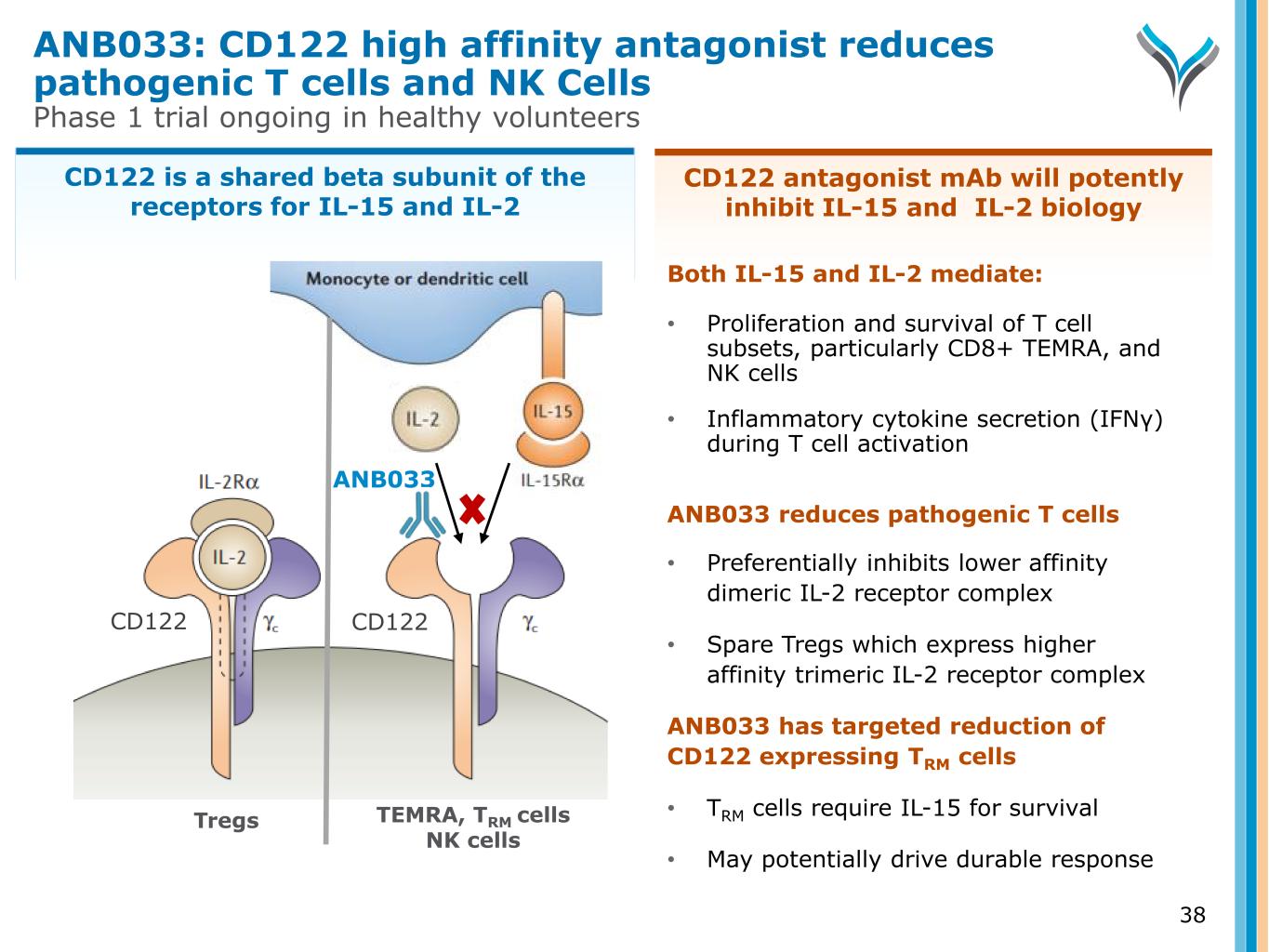 38 CD122 is a shared beta subunit of the receptors for IL-15 and IL-2 CD122 antagonist mAb will potently inhibit IL-15 and IL-2 biology Both IL-15 and IL-2 mediate: • Proliferation and survival of T cell subsets, particularly CD8+ TEMRA, and NK cells • Inflammatory cytokine secretion (IFNγ) during T cell activation ANB033 reduces pathogenic T cells • Preferentially inhibits lower affinity dimeric IL-2 receptor complex • Spare Tregs which express higher affinity trimeric IL-2 receptor complex ANB033 has targeted reduction of CD122 expressing TRM cells • TRM cells require IL-15 for survival • May potentially drive durable response Tregs TEMRA, TRM cells NK cells CD122 CD122 ANB033 ANB033: CD122 high affinity antagonist reduces pathogenic T cells and NK Cells Phase 1 trial ongoing in healthy volunteers