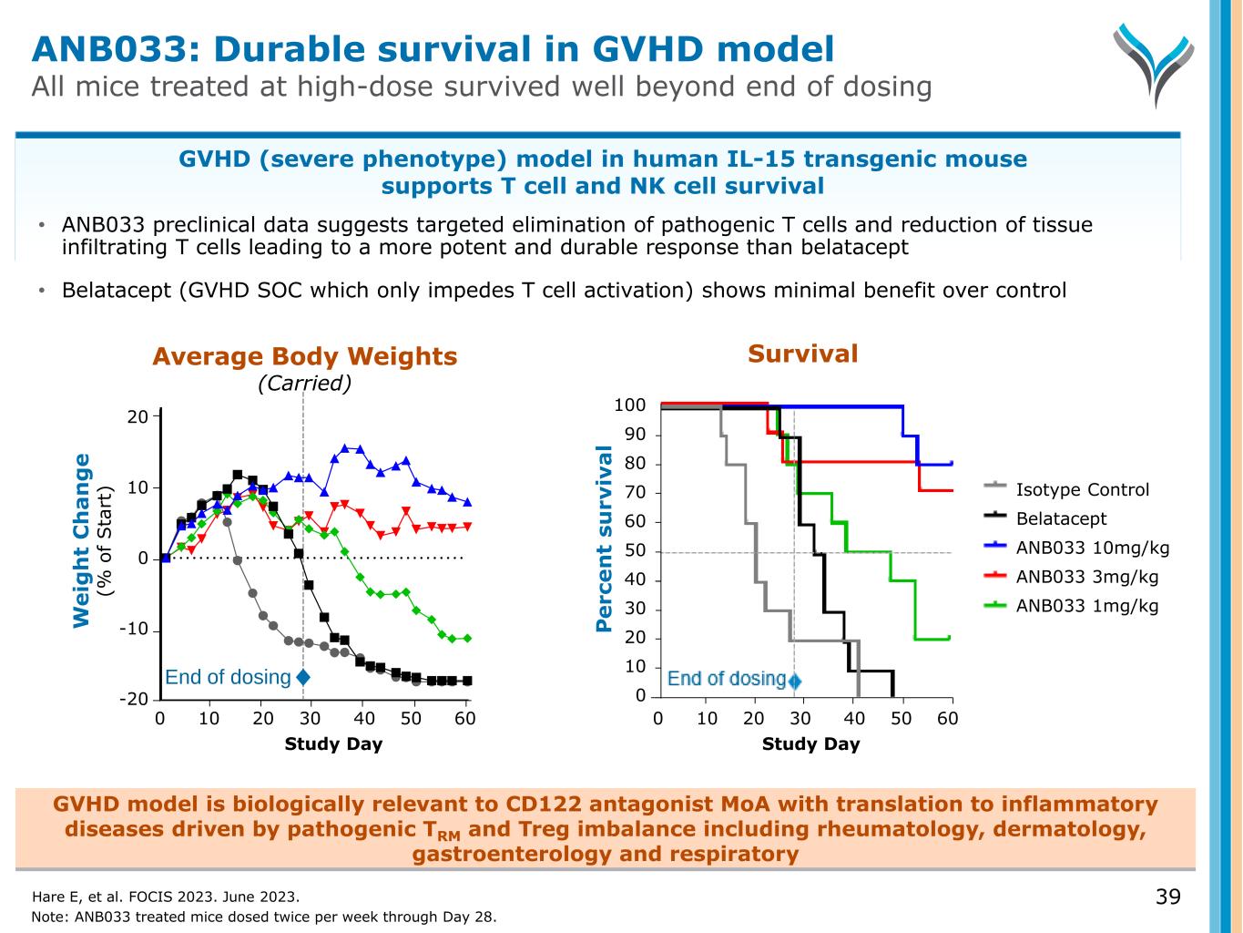 Note: ANB033 treated mice dosed twice per week through Day 28. 39Hare E, et al. FOCIS 2023. June 2023. GVHD model is biologically relevant to CD122 antagonist MoA with translation to inflammatory diseases driven by pathogenic TRM and Treg imbalance including rheumatology, dermatology, gastroenterology and respiratory ANB033: Durable survival in GVHD model All mice treated at high-dose survived well beyond end of dosing GVHD (severe phenotype) model in human IL-15 transgenic mouse supports T cell and NK cell survival • ANB033 preclinical data suggests targeted elimination of pathogenic T cells and reduction of tissue infiltrating T cells leading to a more potent and durable response than belatacept • Belatacept (GVHD SOC which only impedes T cell activation) shows minimal benefit over control End of dosing W e ig h t C h a n g e (% o f S ta rt ) P e r c e n t s u r v iv a l SurvivalAverage Body Weights (Carried) 0 10 20 30 40 50 60 20 10 0 -10 -20 0 10 20 30 40 50 60 -2 -1 1 2 erage Body Weights (carried) Study Day W e ig h t C h a n g e ( % o f S ta rt ) Study Day Study Day 0 10 20 30 40 50 60 Isotype Control Belatacept ANB033 10mg/kg ANB033 3mg/kg ANB033 1mg/kg 100 90 80 70 60 50 40 30 20 10 0