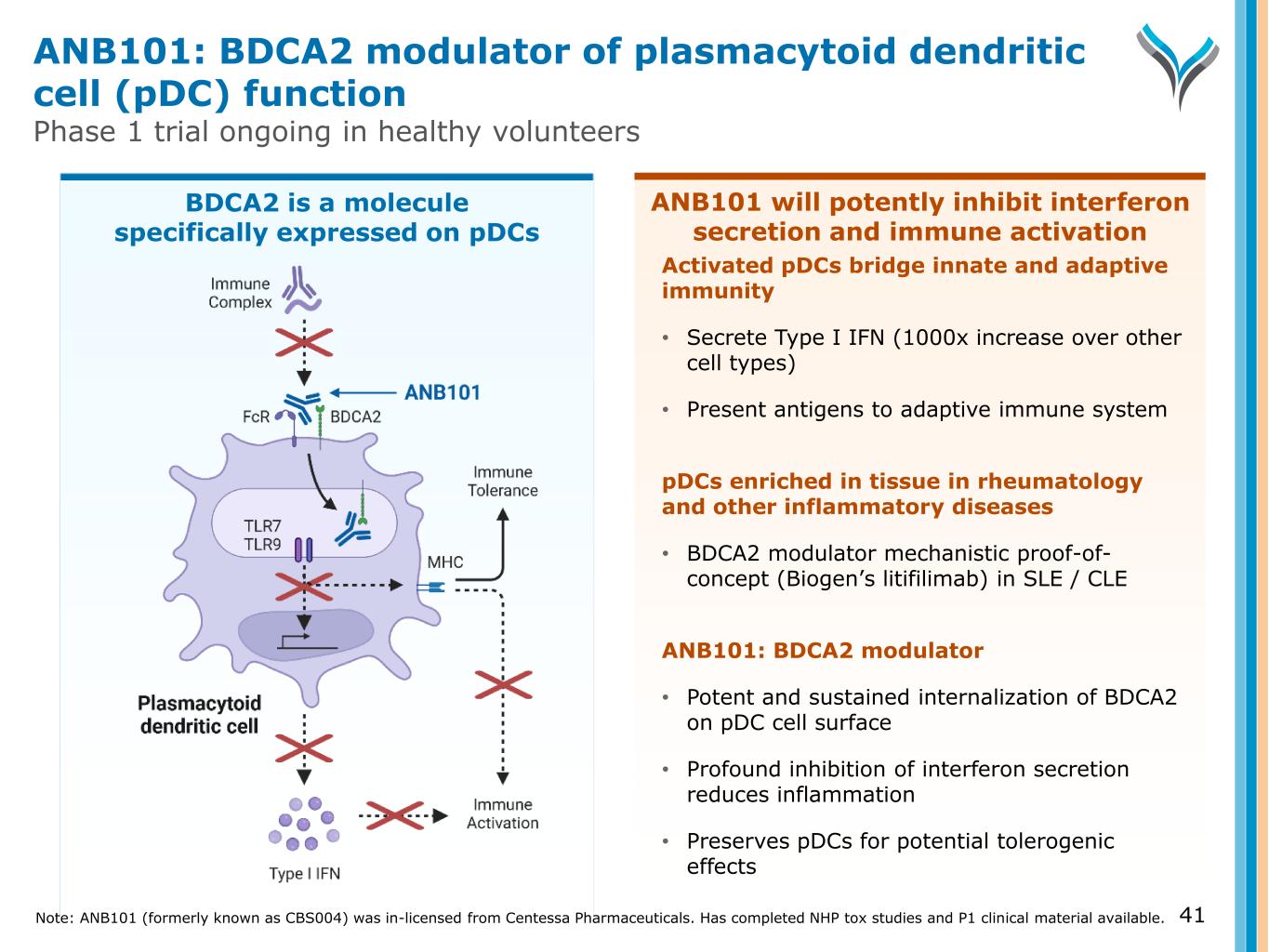 ANB101 will potently inhibit interferon secretion and immune activation 41 Activated pDCs bridge innate and adaptive immunity • Secrete Type I IFN (1000x increase over other cell types) • Present antigens to adaptive immune system pDCs enriched in tissue in rheumatology and other inflammatory diseases • BDCA2 modulator mechanistic proof-of- concept (Biogen’s litifilimab) in SLE / CLE ANB101: BDCA2 modulator • Potent and sustained internalization of BDCA2 on pDC cell surface • Profound inhibition of interferon secretion reduces inflammation • Preserves pDCs for potential tolerogenic effects ANB101: BDCA2 modulator of plasmacytoid dendritic cell (pDC) function Phase 1 trial ongoing in healthy volunteers BDCA2 is a molecule specifically expressed on pDCs Note: ANB101 (formerly known as CBS004) was in-licensed from Centessa Pharmaceuticals. Has completed NHP tox studies and P1 clinical material available.