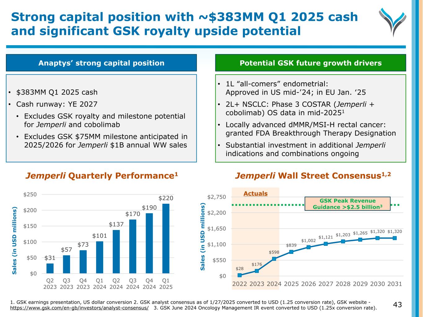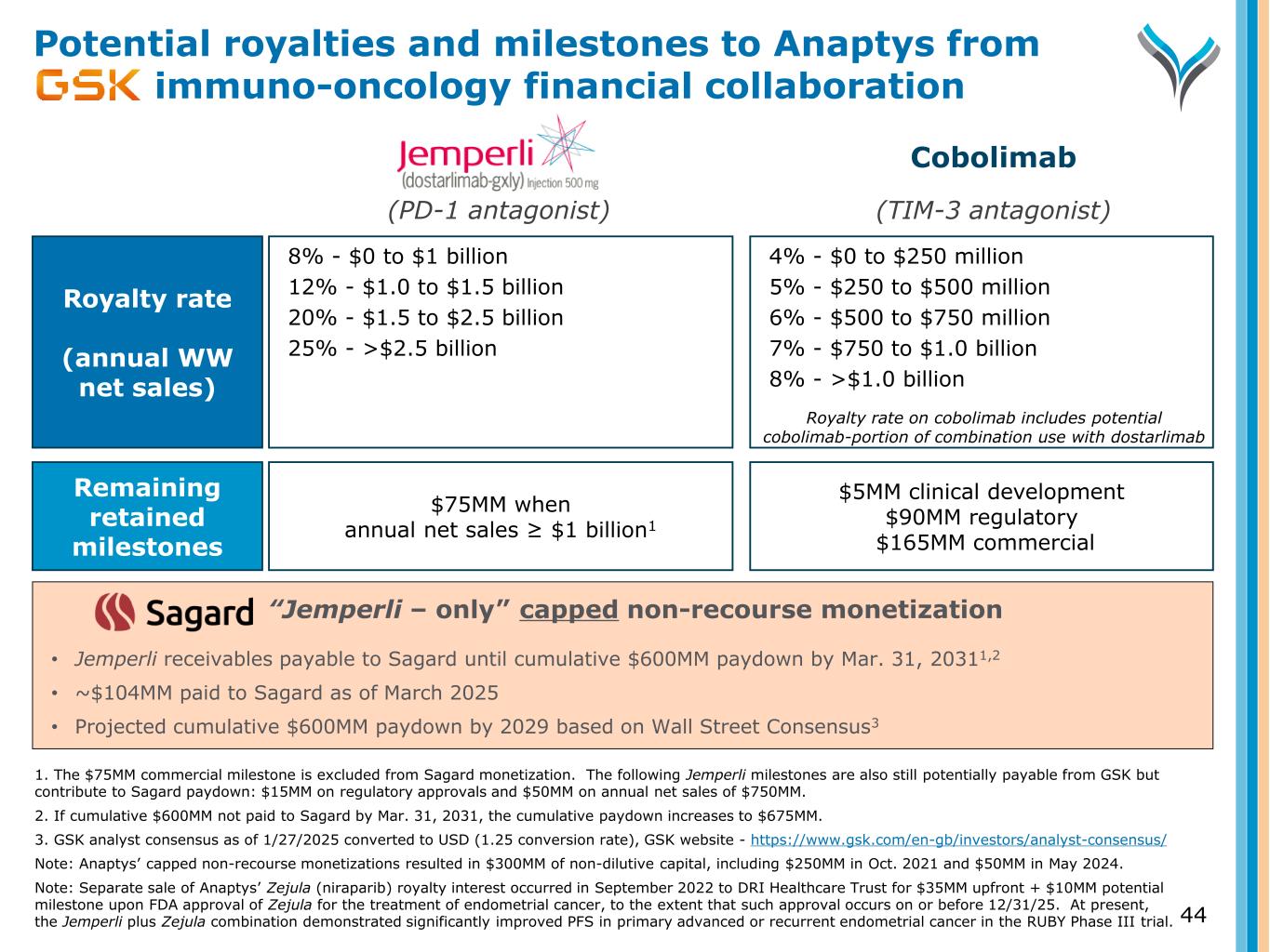 Actuals $31 $57 $73 $101 $137 $170 $190 $220 $0 $50 $100 $150 $200 $250 Q2 2023 Q3 2023 Q4 2023 Q1 2024 Q2 2024 Q3 2024 Q4 2024 Q1 2025 S a le s ( in U S D m il li o n s ) 1. GSK earnings presentation, US dollar conversion 2. GSK analyst consensus as of 1/27/2025 converted to USD (1.25 conversion rate), GSK website - https://www.gsk.com/en-gb/investors/analyst-consensus/ 3. GSK June 2024 Oncology Management IR event converted to USD (1.25x conversion rate). $28 $176 $598 $839 $1,002 $1,121 $1,203 $1,265 $1,320 $1,320 $0 $550 $1,100 $1,650 $2,200 $2,750 2022 2023 2024 2025 2026 2027 2028 2029 2030 2031 S a le s ( in U S D m il li o n s ) Potential GSK future growth drivers • 1L “all-comers” endometrial: Approved in US mid-’24; in EU Jan. ‘25 • 2L+ NSCLC: Phase 3 COSTAR (Jemperli + cobolimab) OS data in mid-20251 • Locally advanced dMMR/MSI-H rectal cancer: granted FDA Breakthrough Therapy Designation • Substantial investment in additional Jemperli indications and combinations ongoing GSK Peak Revenue Guidance >$2.5 billion3 Anaptys’ strong capital position • $383MM Q1 2025 cash • Cash runway: YE 2027 • Excludes GSK royalty and milestone potential for Jemperli and cobolimab • Excludes GSK $75MM milestone anticipated in 2025/2026 for Jemperli $1B annual WW sales Strong capital position with ~$383MM Q1 2025 cash and significant GSK royalty upside potential 43 Jemperli Quarterly Performance1 Jemperli Wall Street Consensus1,2
