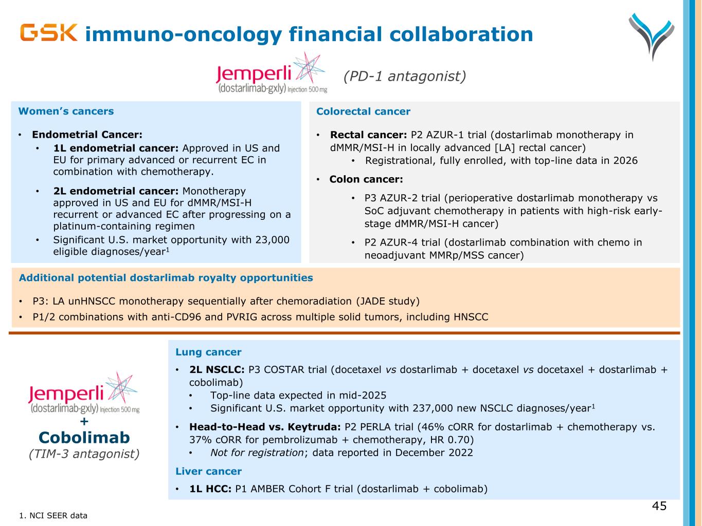 Lung cancer • 2L NSCLC: P3 COSTAR trial (docetaxel vs dostarlimab + docetaxel vs docetaxel + dostarlimab + cobolimab) • Top-line data expected in mid-2025 • Significant U.S. market opportunity with 237,000 new NSCLC diagnoses/year1 • Head-to-Head vs. Keytruda: P2 PERLA trial (46% cORR for dostarlimab + chemotherapy vs. 37% cORR for pembrolizumab + chemotherapy, HR 0.70) • Not for registration; data reported in December 2022 Liver cancer • 1L HCC: P1 AMBER Cohort F trial (dostarlimab + cobolimab) Additional potential dostarlimab royalty opportunities • P3: LA unHNSCC monotherapy sequentially after chemoradiation (JADE study) • P1/2 combinations with anti-CD96 and PVRIG across multiple solid tumors, including HNSCC immuno-oncology financial collaboration + Cobolimab (TIM-3 antagonist) Colorectal cancer • Rectal cancer: P2 AZUR-1 trial (dostarlimab monotherapy in dMMR/MSI-H in locally advanced [LA] rectal cancer) • Registrational, fully enrolled, with top-line data in 2026 • Colon cancer: • P3 AZUR-2 trial (perioperative dostarlimab monotherapy vs SoC adjuvant chemotherapy in patients with high-risk early- stage dMMR/MSI-H cancer) • P2 AZUR-4 trial (dostarlimab combination with chemo in neoadjuvant MMRp/MSS cancer) 1. NCI SEER data 45 Women’s cancers • Endometrial Cancer: • 1L endometrial cancer: Approved in US and EU for primary advanced or recurrent EC in combination with chemotherapy. • 2L endometrial cancer: Monotherapy approved in US and EU for dMMR/MSI-H recurrent or advanced EC after progressing on a platinum-containing regimen • Significant U.S. market opportunity with 23,000 eligible diagnoses/year1 (PD-1 antagonist)