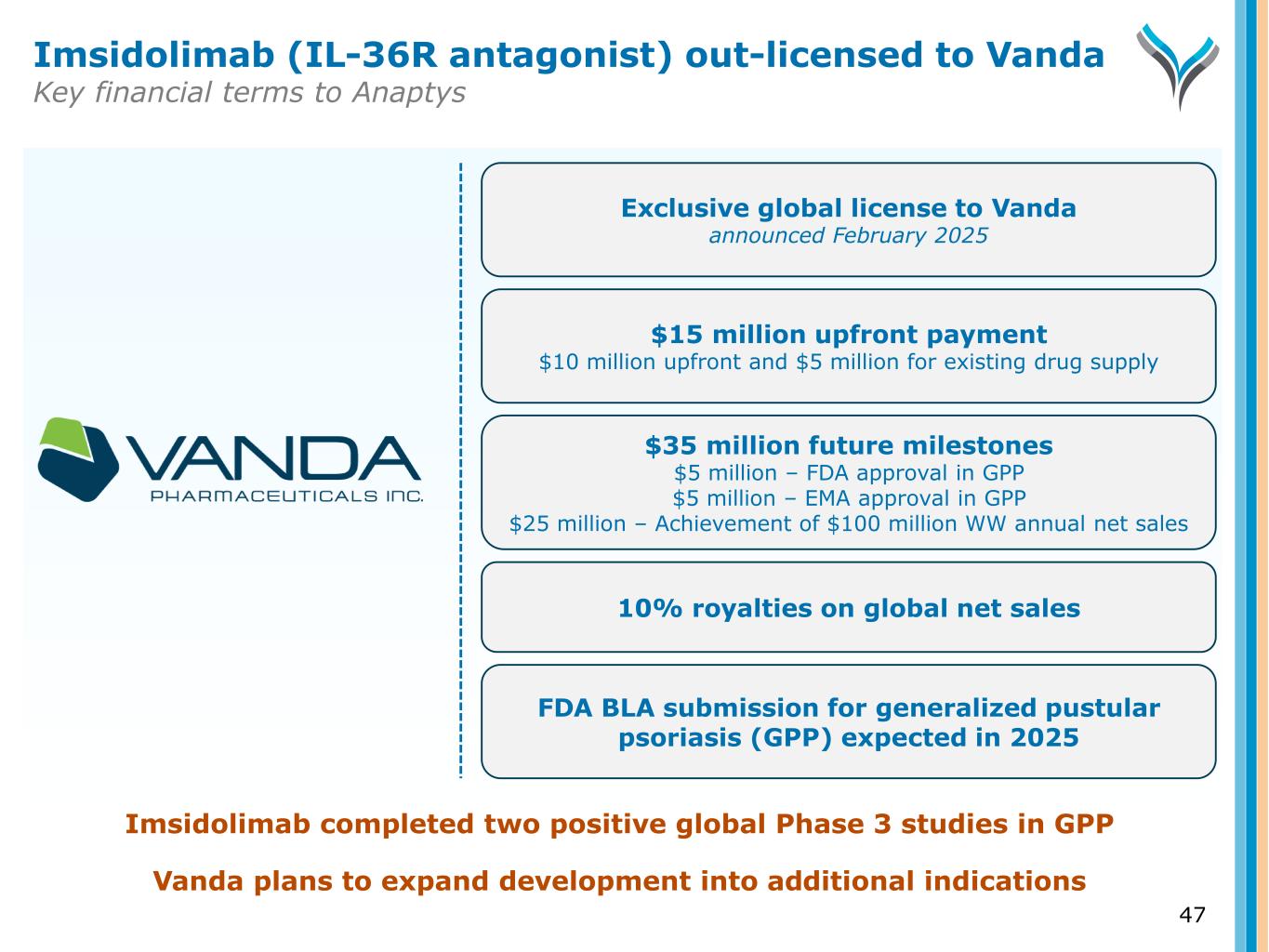 Imsidolimab (IL-36R antagonist) Vanda Pharmaceuticals Financial Collaboration
