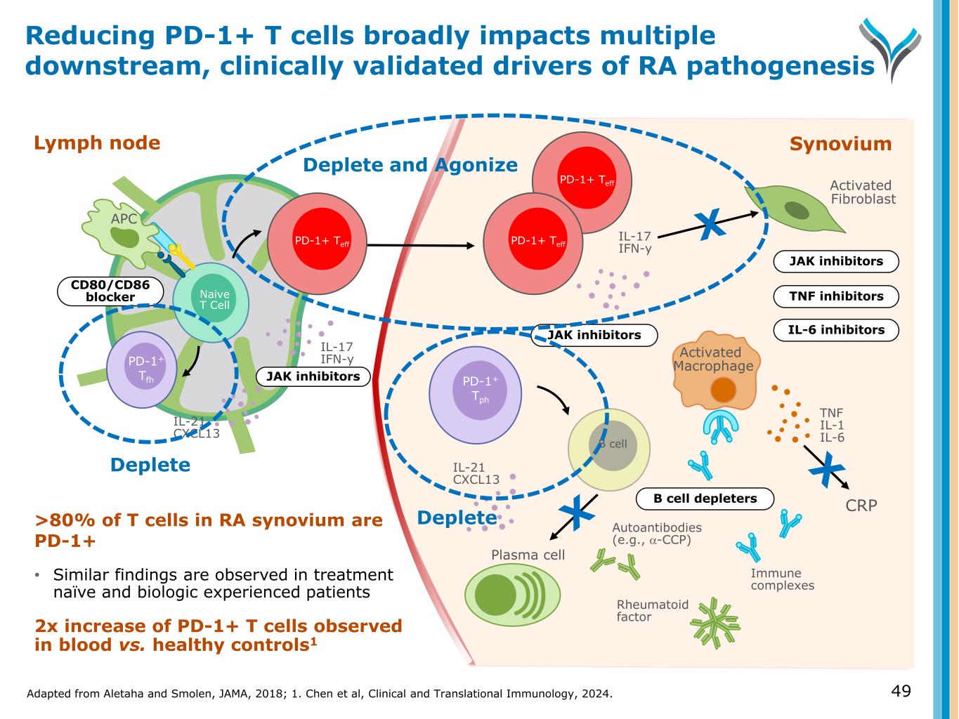Adapted from Aletaha and Smolen, JAMA, 2018; 1. Chen et al, Clinical and Translational Immunology, 2024. 49 Reducing PD-1+ T cells broadly impacts multiple downstream, clinically validated drivers of RA pathogenesis >80% of T cells in RA synovium are PD-1+ • Similar findings are observed in treatment naïve and biologic experienced patients 2x increase of PD-1+ T cells observed in blood vs. healthy controls1 Naive T Cell IL-17 IFN-y IL-21 CXCL13 APC PD-1+ Tfh Lymph node CD80/CD86 blocker JAK inhibitors Synovium PD-1+ Tph Activated Macrophage Activated Fibroblast TNF IL-1 IL-6 B cell IL-21 CXCL13 Plasma cell Autoantibodies (e.g., -CCP) Immune complexes Rheumatoid factor B cell depleters IL-6 inhibitors TNF inhibitors JAK inhibitors JAK inhibitors IL-17 IFN-y PD-1+ Teff PD-1+ TeffPD-1+ Teff Deplete and Agonize Deplete Deplete CRP