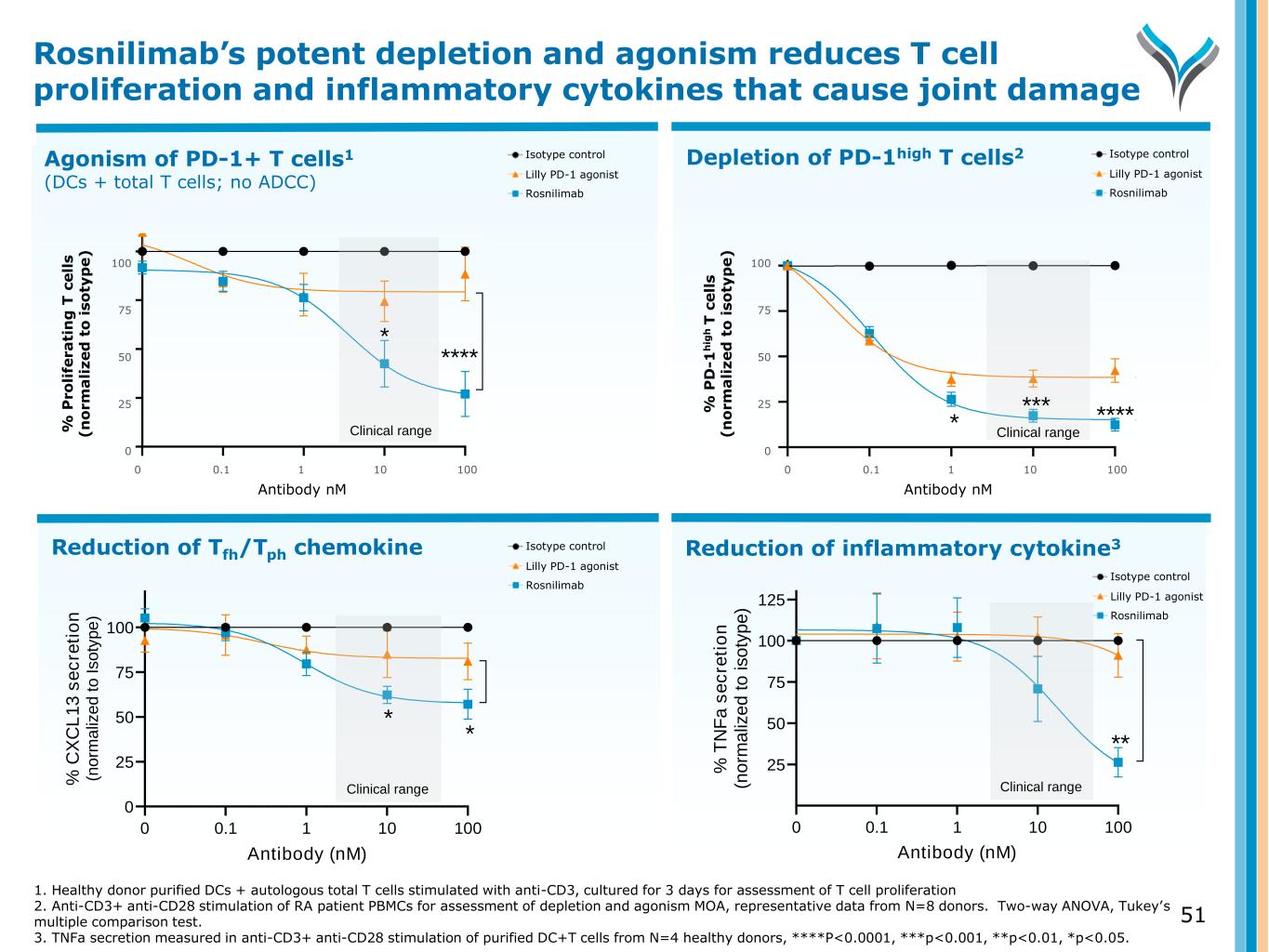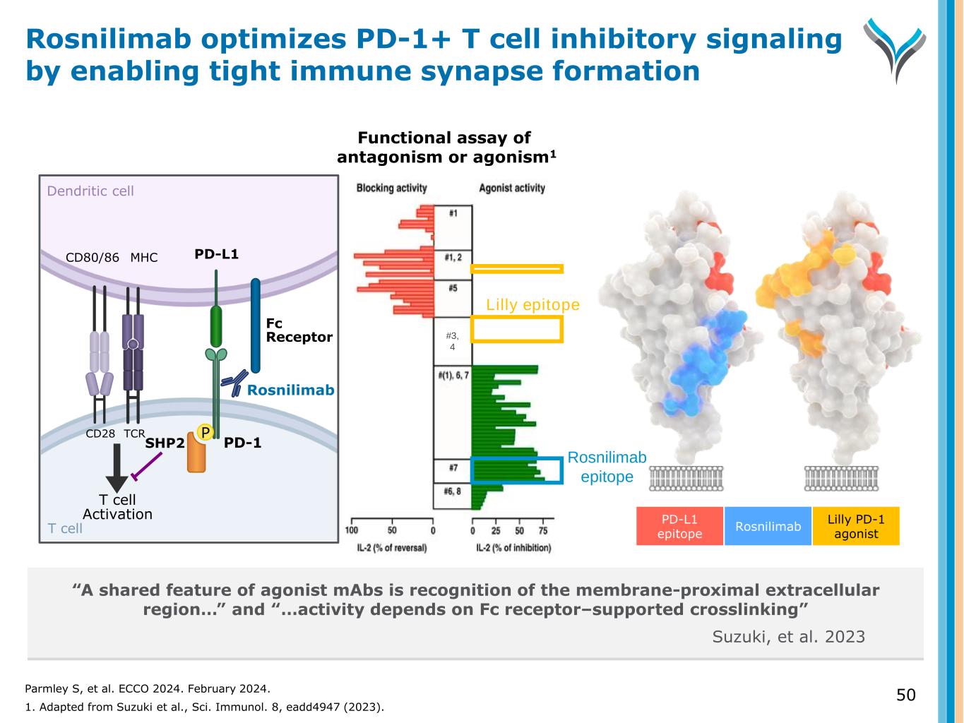 Parmley S, et al. ECCO 2024. February 2024. 1. Adapted from Suzuki et al., Sci. Immunol. 8, eadd4947 (2023). 50 Dendritic cell T cell T cell Activation MHCCD80/86 SHP2 TCRCD28 P PD-1 PD-L1 Rosnilimab Fc Receptor #3, 4 Functional assay of antagonism or agonism1 Lilly epitope PD-L1 epitope Lilly PD-1 agonist Rosnilimab Rosnilimab epitope Rosnilimab optimizes PD-1+ T cell inhibitory signaling by enabling tight immune synapse formation “A shared feature of agonist mAbs is recognition of the membrane-proximal extracellular region…” and “…activity depends on Fc receptor–supported crosslinking” Suzuki, et al. 2023