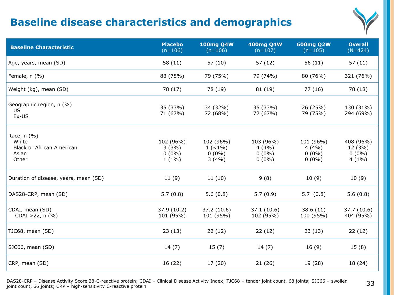 33 Baseline Characteristic Placebo (n=106) 100mg Q4W (n=106) 400mg Q4W (n=107) 600mg Q2W (n=105) Overall (N=424) Age, years, mean (SD) 58 (11) 57 (10) 57 (12) 56 (11) 57 (11) Female, n (%) 83 (78%) 79 (75%) 79 (74%) 80 (76%) 321 (76%) Weight (kg), mean (SD) 78 (17) 78 (19) 81 (19) 77 (16) 78 (18) Geographic region, n (%) US Ex-US 35 (33%) 71 (67%) 34 (32%) 72 (68%) 35 (33%) 72 (67%) 26 (25%) 79 (75%) 130 (31%) 294 (69%) Race, n (%) White Black or African American Asian Other 102 (96%) 3 (3%) 0 (0%) 1 (1%) 102 (96%) 1 (<1%) 0 (0%) 3 (4%) 103 (96%) 4 (4%) 0 (0%) 0 (0%) 101 (96%) 4 (4%) 0 (0%) 0 (0%) 408 (96%) 12 (3%) 0 (0%) 4 (1%) Duration of disease, years, mean (SD) 11 (9) 11 (10) 9 (8) 10 (9) 10 (9) DAS28-CRP, mean (SD) 5.7 (0.8) 5.6 (0.8) 5.7 (0.9) 5.7 (0.8) 5.6 (0.8) CDAI, mean (SD) CDAI >22, n (%) 37.9 (10.2) 101 (95%) 37.2 (10.6) 101 (95%) 37.1 (10.6) 102 (95%) 38.6 (11) 100 (95%) 37.7 (10.6) 404 (95%) TJC68, mean (SD) 23 (13) 22 (12) 22 (12) 23 (13) 22 (12) SJC66, mean (SD) 14 (7) 15 (7) 14 (7) 16 (9) 15 (8) CRP, mean (SD) 16 (22) 17 (20) 21 (26) 19 (28) 18 (24) Baseline disease characteristics and demographics DAS28-CRP – Disease Activity Score 28-C-reactive protein; CDAI – Clinical Disease Activity Index; TJC68 – tender joint count, 68 joints; SJC66 – swollen joint count, 66 joints; CRP – high-sensitivity C-reactive protein