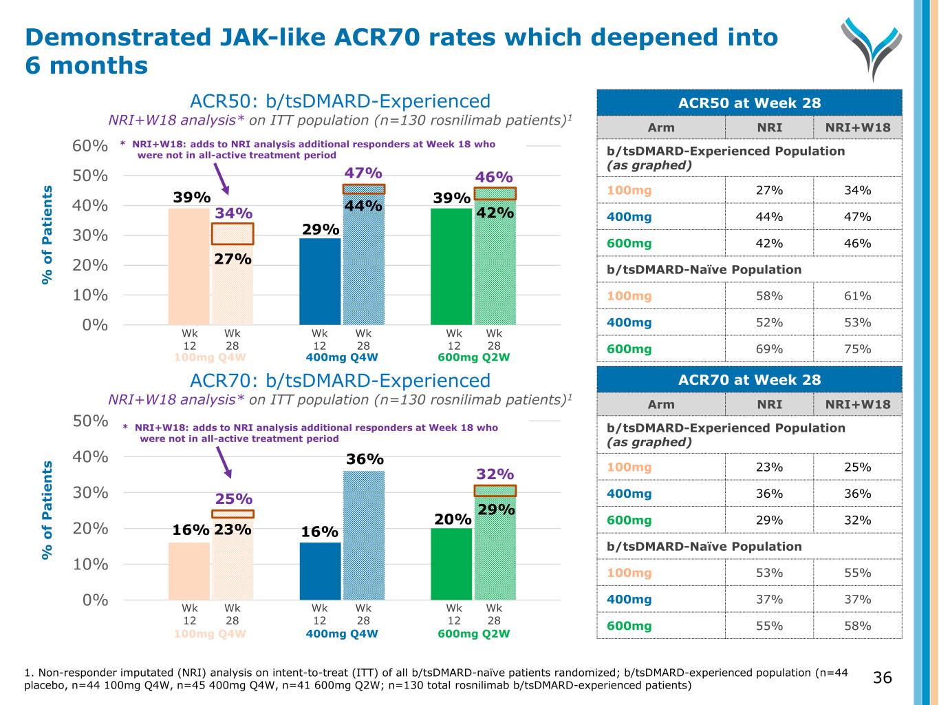 35 0% 20% 40% 60% 80% % o f P a ti e n ts 43% 51% 29%34% CDAI LDA: b/tsDMARD-Experienced NRI+W18 analysis* on ITT population (n=130 rosnilimab patients)1 Wk 12 Wk 28 Wk 12 Wk 28 Wk 12 Wk 28 100mg Q4W 400mg Q4W 600mg Q2W Demonstrated JAK-like CDAI LDA rates by 6 months CDAI LDA at Week 28 Arm NRI NRI+W18 b/tsDMARD-Experienced Population (as graphed) 100mg 34% 43% 400mg 56% 58% 600mg 49% 51% b/tsDMARD-Naïve Population 100mg 66% 71% 400mg 53% 55% 600mg 72% 75% 56% 49% 43% 58% 51% 1. Non-responder imputated (NRI) analysis on intent-to-treat (ITT) of all b/tsDMARD-naïve patients randomized; b/tsDMARD-experienced population (n=44 placebo, n=44 100mg Q4W, n=45 400mg Q4W, n=41 600mg Q2W; n=130 total rosnilimab b/tsDMARD-experienced patients) * NRI+W18: adds to NRI analysis additional responders at Week 18 who were not in all-active treatment period