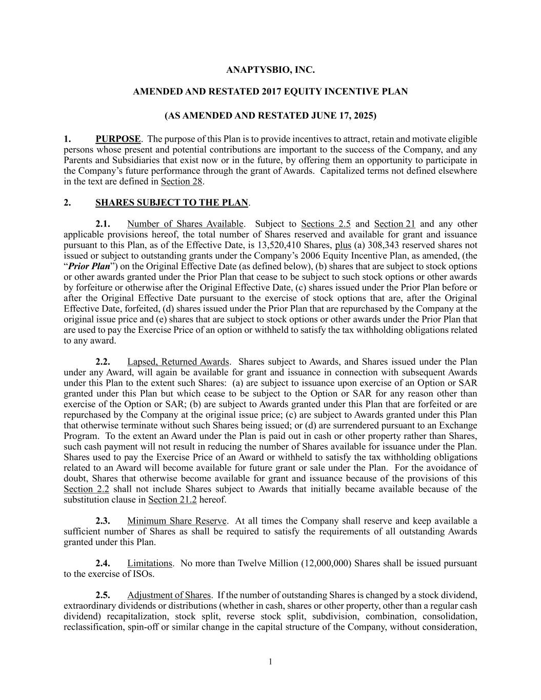 1 ANAPTYSBIO, INC. AMENDED AND RESTATED 2017 EQUITY INCENTIVE PLAN (AS AMENDED AND RESTATED JUNE 17, 2025) 1. PURPOSE. The purpose of this Plan is to provide incentives to attract, retain and motivate eligible persons whose present and potential contributions are important to the success of the Company, and any Parents and Subsidiaries that exist now or in the future, by offering them an opportunity to participate in the Company’s future performance through the grant of Awards. Capitalized terms not defined elsewhere in the text are defined in Section 28. 2. SHARES SUBJECT TO THE PLAN. 2.1. Number of Shares Available. Subject to Sections 2.5 and Section 21 and any other applicable provisions hereof, the total number of Shares reserved and available for grant and issuance pursuant to this Plan, as of the Effective Date, is 13,520,410 Shares, plus (a) 308,343 reserved shares not issued or subject to outstanding grants under the Company’s 2006 Equity Incentive Plan, as amended, (the “Prior Plan”) on the Original Effective Date (as defined below), (b) shares that are subject to stock options or other awards granted under the Prior Plan that cease to be subject to such stock options or other awards by forfeiture or otherwise after the Original Effective Date, (c) shares issued under the Prior Plan before or after the Original Effective Date pursuant to the exercise of stock options that are, after the Original Effective Date, forfeited, (d) shares issued under the Prior Plan that are repurchased by the Company at the original issue price and (e) shares that are subject to stock options or other awards under the Prior Plan that are used to pay the Exercise Price of an option or withheld to satisfy the tax withholding obligations related to any award. 2.2. Lapsed, Returned Awards. Shares subject to Awards, and Shares issued under the Plan under any Award, will again be available for grant and issuance in connection with subsequent Awards under this Plan to the extent such Shares: (a) are subject to issuance upon exercise of an Option or SAR granted under this Plan but which cease to be subject to the Option or SAR for any reason other than exercise of the Option or SAR; (b) are subject to Awards granted under this Plan that are forfeited or are repurchased by the Company at the original issue price; (c) are subject to Awards granted under this Plan that otherwise terminate without such Shares being issued; or (d) are surrendered pursuant to an Exchange Program. To the extent an Award under the Plan is paid out in cash or other property rather than Shares, such cash payment will not result in reducing the number of Shares available for issuance under the Plan. Shares used to pay the Exercise Price of an Award or withheld to satisfy the tax withholding obligations related to an Award will become available for future grant or sale under the Plan. For the avoidance of doubt, Shares that otherwise become available for grant and issuance because of the provisions of this Section 2.2 shall not include Shares subject to Awards that initially became available because of the substitution clause in Section 21.2 hereof. 2.3. Minimum Share Reserve. At all times the Company shall reserve and keep available a sufficient number of Shares as shall be required to satisfy the requirements of all outstanding Awards granted under this Plan. 2.4. Limitations. No more than Twelve Million (12,000,000) Shares shall be issued pursuant to the exercise of ISOs. 2.5. Adjustment of Shares. If the number of outstanding Shares is changed by a stock dividend, extraordinary dividends or distributions (whether in cash, shares or other property, other than a regular cash dividend) recapitalization, stock split, reverse stock split, subdivision, combination, consolidation, reclassification, spin-off or similar change in the capital structure of the Company, without consideration,
