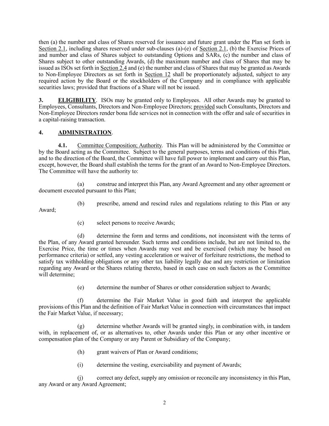 2 then (a) the number and class of Shares reserved for issuance and future grant under the Plan set forth in Section 2.1, including shares reserved under sub-clauses (a)-(e) of Section 2.1, (b) the Exercise Prices of and number and class of Shares subject to outstanding Options and SARs, (c) the number and class of Shares subject to other outstanding Awards, (d) the maximum number and class of Shares that may be issued as ISOs set forth in Section 2.4 and (e) the number and class of Shares that may be granted as Awards to Non-Employee Directors as set forth in Section 12 shall be proportionately adjusted, subject to any required action by the Board or the stockholders of the Company and in compliance with applicable securities laws; provided that fractions of a Share will not be issued. 3. ELIGIBILITY. ISOs may be granted only to Employees. All other Awards may be granted to Employees, Consultants, Directors and Non-Employee Directors; provided such Consultants, Directors and Non-Employee Directors render bona fide services not in connection with the offer and sale of securities in a capital-raising transaction. 4. ADMINISTRATION. 4.1. Committee Composition; Authority. This Plan will be administered by the Committee or by the Board acting as the Committee. Subject to the general purposes, terms and conditions of this Plan, and to the direction of the Board, the Committee will have full power to implement and carry out this Plan, except, however, the Board shall establish the terms for the grant of an Award to Non-Employee Directors. The Committee will have the authority to: (a) construe and interpret this Plan, any Award Agreement and any other agreement or document executed pursuant to this Plan; (b) prescribe, amend and rescind rules and regulations relating to this Plan or any Award; (c) select persons to receive Awards; (d) determine the form and terms and conditions, not inconsistent with the terms of the Plan, of any Award granted hereunder. Such terms and conditions include, but are not limited to, the Exercise Price, the time or times when Awards may vest and be exercised (which may be based on performance criteria) or settled, any vesting acceleration or waiver of forfeiture restrictions, the method to satisfy tax withholding obligations or any other tax liability legally due and any restriction or limitation regarding any Award or the Shares relating thereto, based in each case on such factors as the Committee will determine; (e) determine the number of Shares or other consideration subject to Awards; (f) determine the Fair Market Value in good faith and interpret the applicable provisions of this Plan and the definition of Fair Market Value in connection with circumstances that impact the Fair Market Value, if necessary; (g) determine whether Awards will be granted singly, in combination with, in tandem with, in replacement of, or as alternatives to, other Awards under this Plan or any other incentive or compensation plan of the Company or any Parent or Subsidiary of the Company; (h) grant waivers of Plan or Award conditions; (i) determine the vesting, exercisability and payment of Awards; (j) correct any defect, supply any omission or reconcile any inconsistency in this Plan, any Award or any Award Agreement;