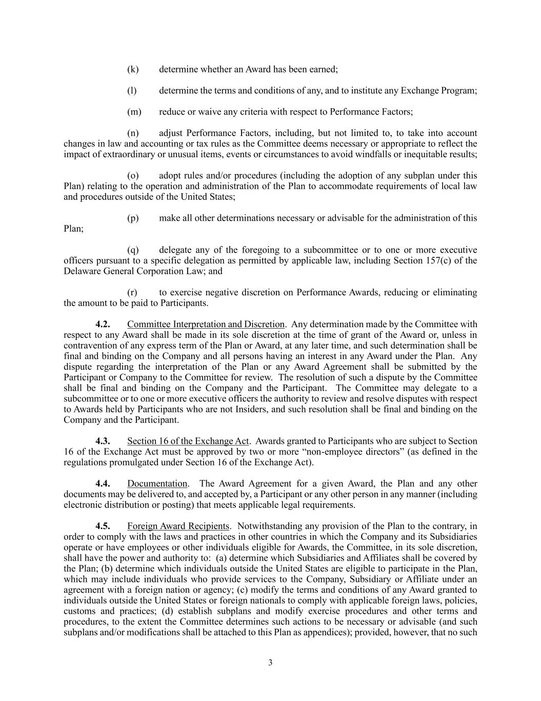 3 (k) determine whether an Award has been earned; (l) determine the terms and conditions of any, and to institute any Exchange Program; (m) reduce or waive any criteria with respect to Performance Factors; (n) adjust Performance Factors, including, but not limited to, to take into account changes in law and accounting or tax rules as the Committee deems necessary or appropriate to reflect the impact of extraordinary or unusual items, events or circumstances to avoid windfalls or inequitable results; (o) adopt rules and/or procedures (including the adoption of any subplan under this Plan) relating to the operation and administration of the Plan to accommodate requirements of local law and procedures outside of the United States; (p) make all other determinations necessary or advisable for the administration of this Plan; (q) delegate any of the foregoing to a subcommittee or to one or more executive officers pursuant to a specific delegation as permitted by applicable law, including Section 157(c) of the Delaware General Corporation Law; and (r) to exercise negative discretion on Performance Awards, reducing or eliminating the amount to be paid to Participants. 4.2. Committee Interpretation and Discretion. Any determination made by the Committee with respect to any Award shall be made in its sole discretion at the time of grant of the Award or, unless in contravention of any express term of the Plan or Award, at any later time, and such determination shall be final and binding on the Company and all persons having an interest in any Award under the Plan. Any dispute regarding the interpretation of the Plan or any Award Agreement shall be submitted by the Participant or Company to the Committee for review. The resolution of such a dispute by the Committee shall be final and binding on the Company and the Participant. The Committee may delegate to a subcommittee or to one or more executive officers the authority to review and resolve disputes with respect to Awards held by Participants who are not Insiders, and such resolution shall be final and binding on the Company and the Participant. 4.3. Section 16 of the Exchange Act. Awards granted to Participants who are subject to Section 16 of the Exchange Act must be approved by two or more “non-employee directors” (as defined in the regulations promulgated under Section 16 of the Exchange Act). 4.4. Documentation. The Award Agreement for a given Award, the Plan and any other documents may be delivered to, and accepted by, a Participant or any other person in any manner (including electronic distribution or posting) that meets applicable legal requirements. 4.5. Foreign Award Recipients. Notwithstanding any provision of the Plan to the contrary, in order to comply with the laws and practices in other countries in which the Company and its Subsidiaries operate or have employees or other individuals eligible for Awards, the Committee, in its sole discretion, shall have the power and authority to: (a) determine which Subsidiaries and Affiliates shall be covered by the Plan; (b) determine which individuals outside the United States are eligible to participate in the Plan, which may include individuals who provide services to the Company, Subsidiary or Affiliate under an agreement with a foreign nation or agency; (c) modify the terms and conditions of any Award granted to individuals outside the United States or foreign nationals to comply with applicable foreign laws, policies, customs and practices; (d) establish subplans and modify exercise procedures and other terms and procedures, to the extent the Committee determines such actions to be necessary or advisable (and such subplans and/or modifications shall be attached to this Plan as appendices); provided, however, that no such
