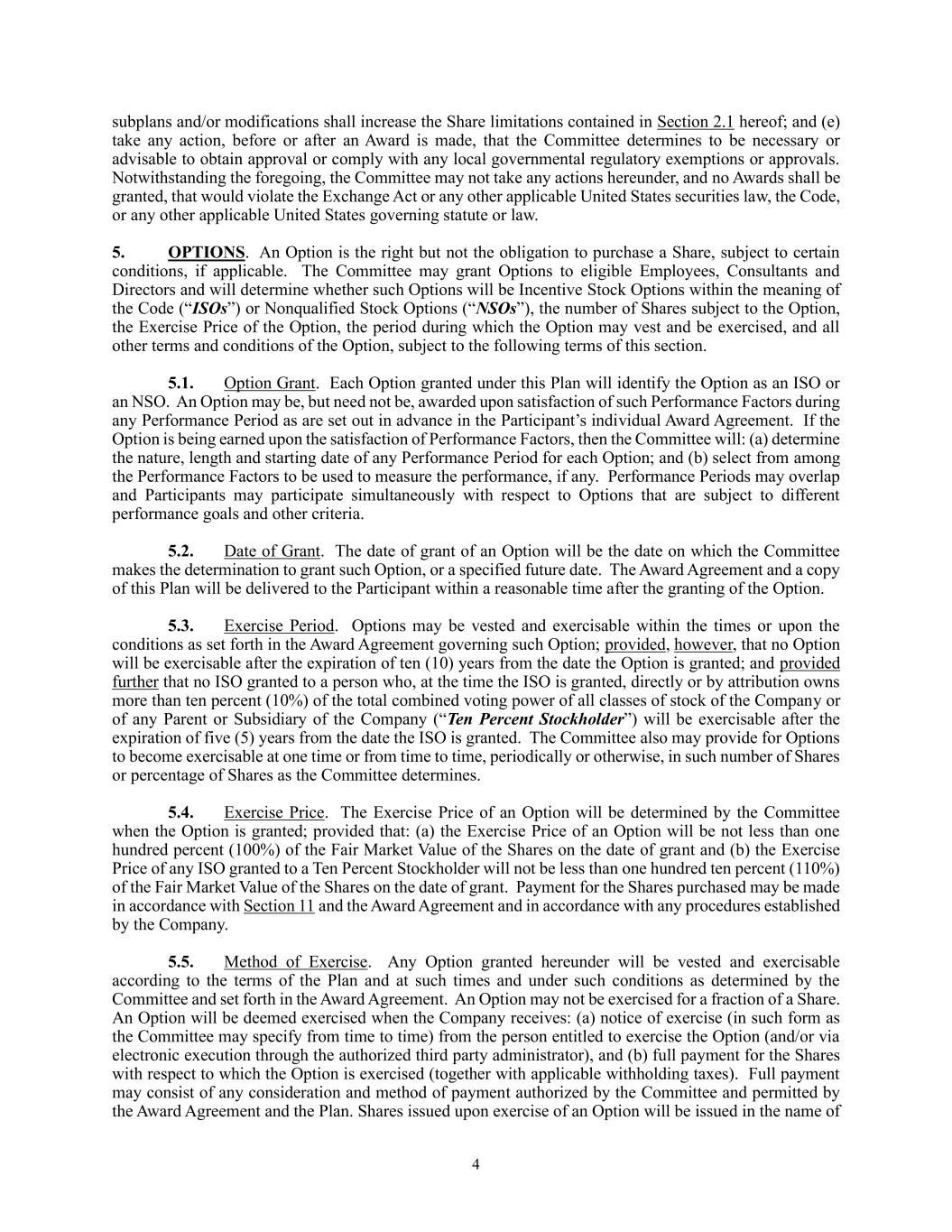 4 subplans and/or modifications shall increase the Share limitations contained in Section 2.1 hereof; and (e) take any action, before or after an Award is made, that the Committee determines to be necessary or advisable to obtain approval or comply with any local governmental regulatory exemptions or approvals. Notwithstanding the foregoing, the Committee may not take any actions hereunder, and no Awards shall be granted, that would violate the Exchange Act or any other applicable United States securities law, the Code, or any other applicable United States governing statute or law. 5. OPTIONS. An Option is the right but not the obligation to purchase a Share, subject to certain conditions, if applicable. The Committee may grant Options to eligible Employees, Consultants and Directors and will determine whether such Options will be Incentive Stock Options within the meaning of the Code (“ISOs”) or Nonqualified Stock Options (“NSOs”), the number of Shares subject to the Option, the Exercise Price of the Option, the period during which the Option may vest and be exercised, and all other terms and conditions of the Option, subject to the following terms of this section. 5.1. Option Grant. Each Option granted under this Plan will identify the Option as an ISO or an NSO. An Option may be, but need not be, awarded upon satisfaction of such Performance Factors during any Performance Period as are set out in advance in the Participant’s individual Award Agreement. If the Option is being earned upon the satisfaction of Performance Factors, then the Committee will: (a) determine the nature, length and starting date of any Performance Period for each Option; and (b) select from among the Performance Factors to be used to measure the performance, if any. Performance Periods may overlap and Participants may participate simultaneously with respect to Options that are subject to different performance goals and other criteria. 5.2. Date of Grant. The date of grant of an Option will be the date on which the Committee makes the determination to grant such Option, or a specified future date. The Award Agreement and a copy of this Plan will be delivered to the Participant within a reasonable time after the granting of the Option. 5.3. Exercise Period. Options may be vested and exercisable within the times or upon the conditions as set forth in the Award Agreement governing such Option; provided, however, that no Option will be exercisable after the expiration of ten (10) years from the date the Option is granted; and provided further that no ISO granted to a person who, at the time the ISO is granted, directly or by attribution owns more than ten percent (10%) of the total combined voting power of all classes of stock of the Company or of any Parent or Subsidiary of the Company (“Ten Percent Stockholder”) will be exercisable after the expiration of five (5) years from the date the ISO is granted. The Committee also may provide for Options to become exercisable at one time or from time to time, periodically or otherwise, in such number of Shares or percentage of Shares as the Committee determines. 5.4. Exercise Price. The Exercise Price of an Option will be determined by the Committee when the Option is granted; provided that: (a) the Exercise Price of an Option will be not less than one hundred percent (100%) of the Fair Market Value of the Shares on the date of grant and (b) the Exercise Price of any ISO granted to a Ten Percent Stockholder will not be less than one hundred ten percent (110%) of the Fair Market Value of the Shares on the date of grant. Payment for the Shares purchased may be made in accordance with Section 11 and the Award Agreement and in accordance with any procedures established by the Company. 5.5. Method of Exercise. Any Option granted hereunder will be vested and exercisable according to the terms of the Plan and at such times and under such conditions as determined by the Committee and set forth in the Award Agreement. An Option may not be exercised for a fraction of a Share. An Option will be deemed exercised when the Company receives: (a) notice of exercise (in such form as the Committee may specify from time to time) from the person entitled to exercise the Option (and/or via electronic execution through the authorized third party administrator), and (b) full payment for the Shares with respect to which the Option is exercised (together with applicable withholding taxes). Full payment may consist of any consideration and method of payment authorized by the Committee and permitted by the Award Agreement and the Plan. Shares issued upon exercise of an Option will be issued in the name of
