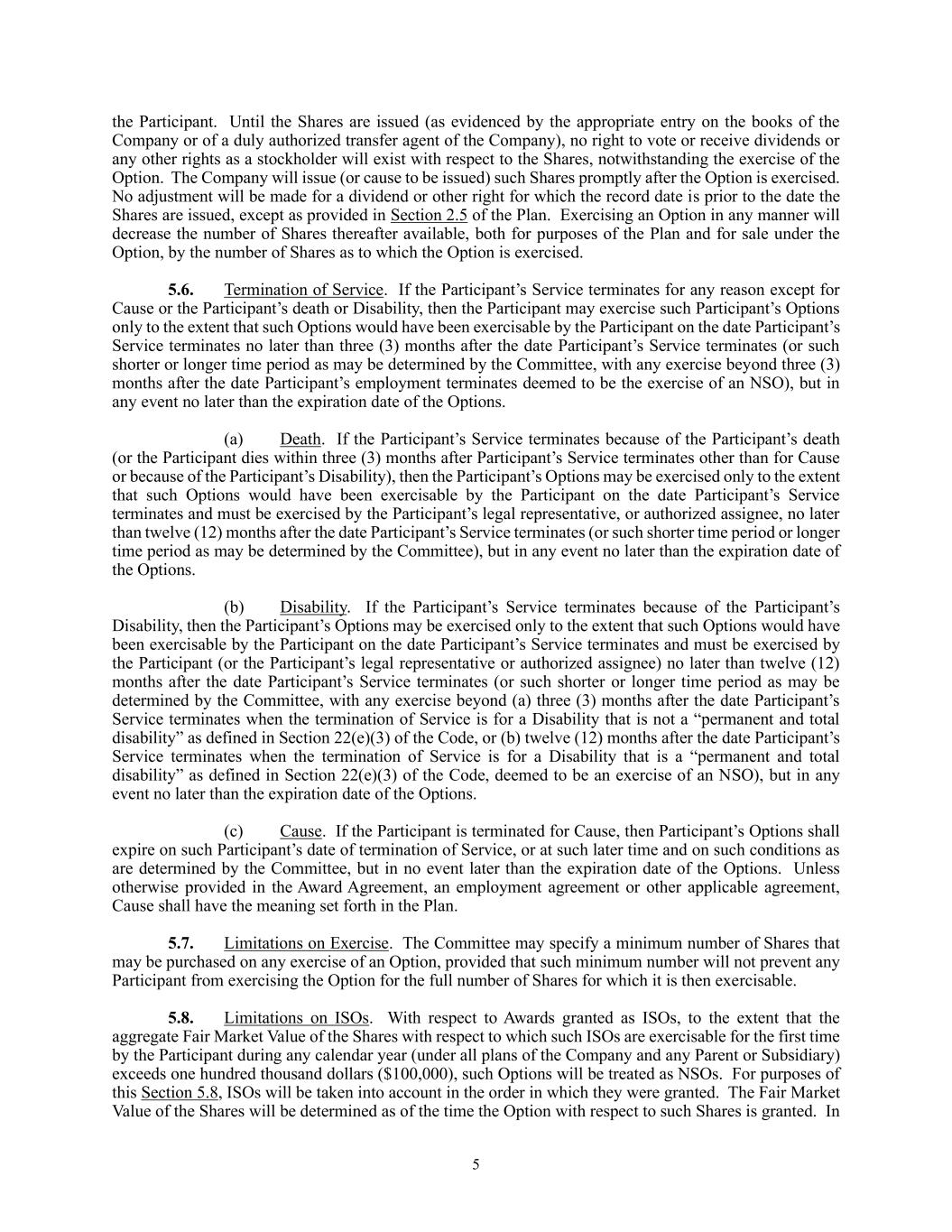 5 the Participant. Until the Shares are issued (as evidenced by the appropriate entry on the books of the Company or of a duly authorized transfer agent of the Company), no right to vote or receive dividends or any other rights as a stockholder will exist with respect to the Shares, notwithstanding the exercise of the Option. The Company will issue (or cause to be issued) such Shares promptly after the Option is exercised. No adjustment will be made for a dividend or other right for which the record date is prior to the date the Shares are issued, except as provided in Section 2.5 of the Plan. Exercising an Option in any manner will decrease the number of Shares thereafter available, both for purposes of the Plan and for sale under the Option, by the number of Shares as to which the Option is exercised. 5.6. Termination of Service. If the Participant’s Service terminates for any reason except for Cause or the Participant’s death or Disability, then the Participant may exercise such Participant’s Options only to the extent that such Options would have been exercisable by the Participant on the date Participant’s Service terminates no later than three (3) months after the date Participant’s Service terminates (or such shorter or longer time period as may be determined by the Committee, with any exercise beyond three (3) months after the date Participant’s employment terminates deemed to be the exercise of an NSO), but in any event no later than the expiration date of the Options. (a) Death. If the Participant’s Service terminates because of the Participant’s death (or the Participant dies within three (3) months after Participant’s Service terminates other than for Cause or because of the Participant’s Disability), then the Participant’s Options may be exercised only to the extent that such Options would have been exercisable by the Participant on the date Participant’s Service terminates and must be exercised by the Participant’s legal representative, or authorized assignee, no later than twelve (12) months after the date Participant’s Service terminates (or such shorter time period or longer time period as may be determined by the Committee), but in any event no later than the expiration date of the Options. (b) Disability. If the Participant’s Service terminates because of the Participant’s Disability, then the Participant’s Options may be exercised only to the extent that such Options would have been exercisable by the Participant on the date Participant’s Service terminates and must be exercised by the Participant (or the Participant’s legal representative or authorized assignee) no later than twelve (12) months after the date Participant’s Service terminates (or such shorter or longer time period as may be determined by the Committee, with any exercise beyond (a) three (3) months after the date Participant’s Service terminates when the termination of Service is for a Disability that is not a “permanent and total disability” as defined in Section 22(e)(3) of the Code, or (b) twelve (12) months after the date Participant’s Service terminates when the termination of Service is for a Disability that is a “permanent and total disability” as defined in Section 22(e)(3) of the Code, deemed to be an exercise of an NSO), but in any event no later than the expiration date of the Options. (c) Cause. If the Participant is terminated for Cause, then Participant’s Options shall expire on such Participant’s date of termination of Service, or at such later time and on such conditions as are determined by the Committee, but in no event later than the expiration date of the Options. Unless otherwise provided in the Award Agreement, an employment agreement or other applicable agreement, Cause shall have the meaning set forth in the Plan. 5.7. Limitations on Exercise. The Committee may specify a minimum number of Shares that may be purchased on any exercise of an Option, provided that such minimum number will not prevent any Participant from exercising the Option for the full number of Shares for which it is then exercisable. 5.8. Limitations on ISOs. With respect to Awards granted as ISOs, to the extent that the aggregate Fair Market Value of the Shares with respect to which such ISOs are exercisable for the first time by the Participant during any calendar year (under all plans of the Company and any Parent or Subsidiary) exceeds one hundred thousand dollars ($100,000), such Options will be treated as NSOs. For purposes of this Section 5.8, ISOs will be taken into account in the order in which they were granted. The Fair Market Value of the Shares will be determined as of the time the Option with respect to such Shares is granted. In